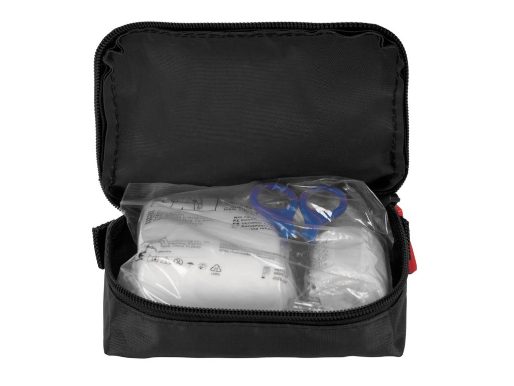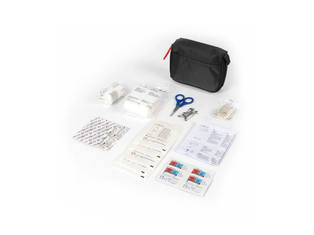 Lekárnička MDR triedy 2a. Nylónový obal, trvanlivosť 5 rokov. Obsah: 9 náplastí, 8 špendlíkov, 5 suchých tampónov, 4 tampóny na čistenie pokožky, 1 trojuholníkový obväz, 1 mini nožnice, 1 elastický obväz, 1 lekárska páska a 1 návod na použitie.