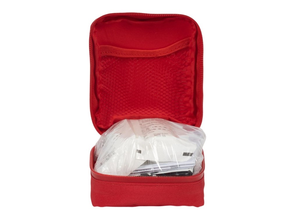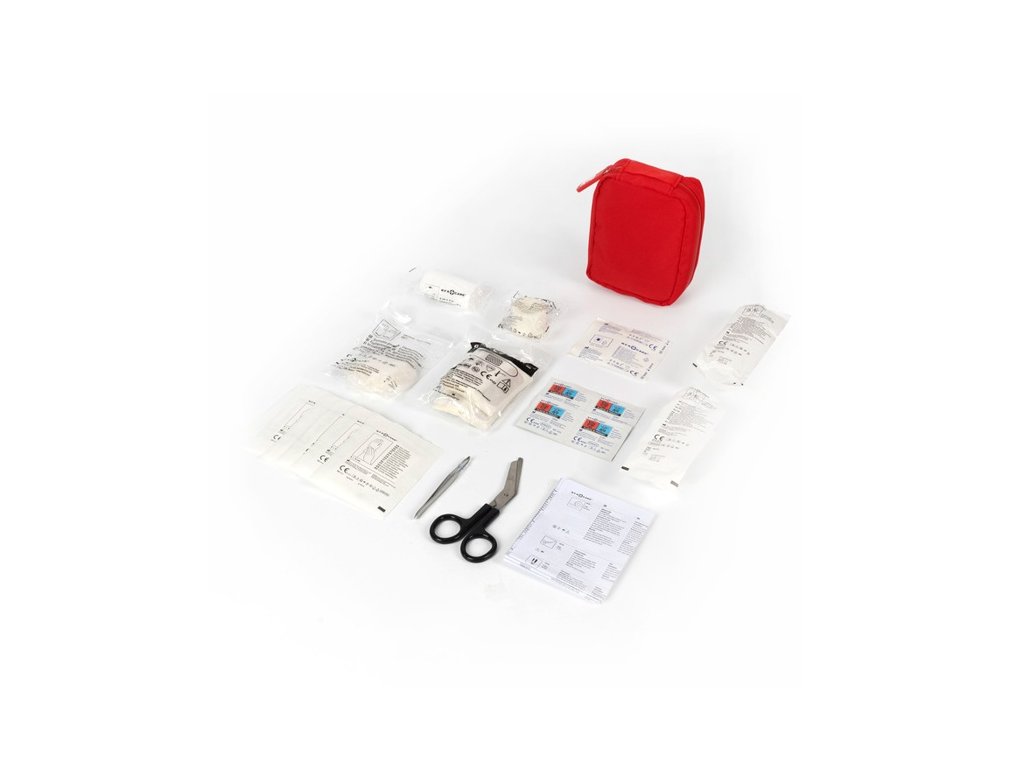 Lekárnička MDR triedy 2a. Trvanlivosť 5 rokov. 40 vodeodolných náplastí, 6 suchých tampónov, 4 tampóny na pokožku, 2 obväzy, 1 elastický obväz, 1 nožnice, 1 pinzeta, 1 odstraňovač popálenín, 1 pár jednorazových rukavíc, 1 lekárska páska a 1 návod.