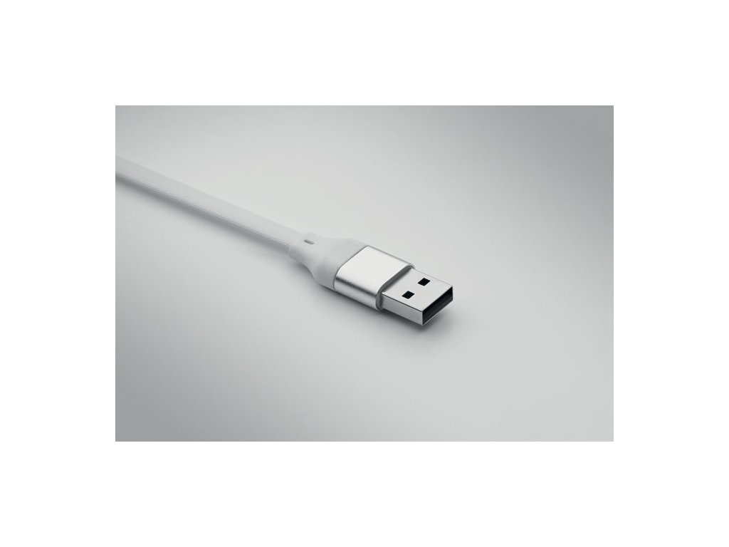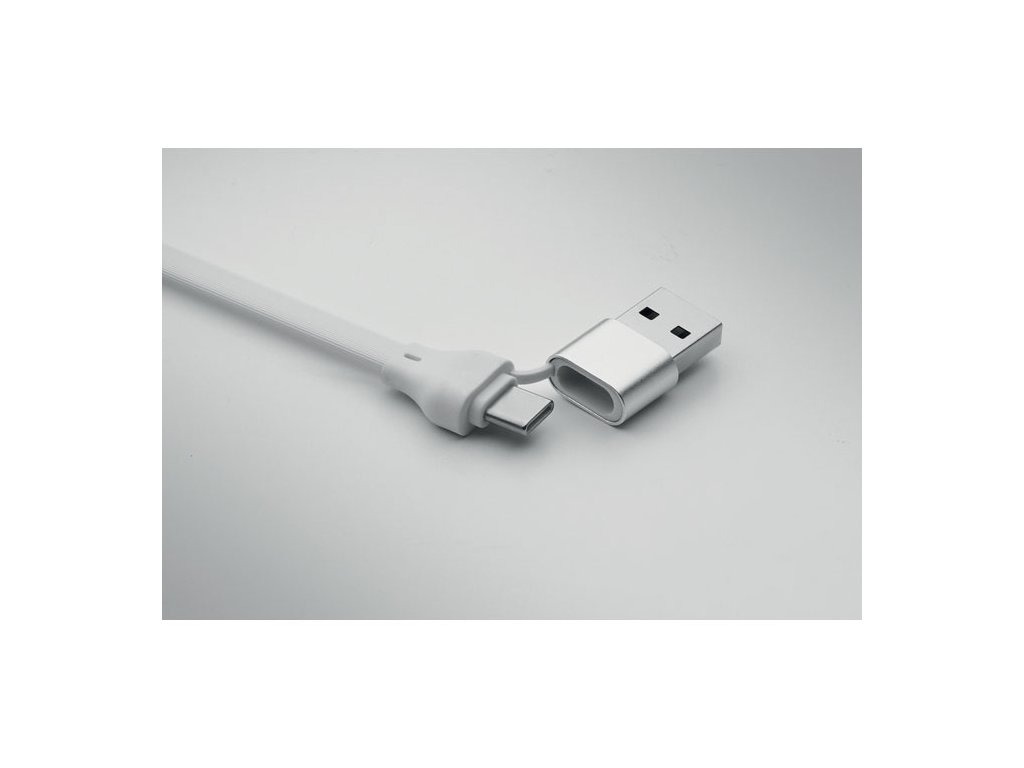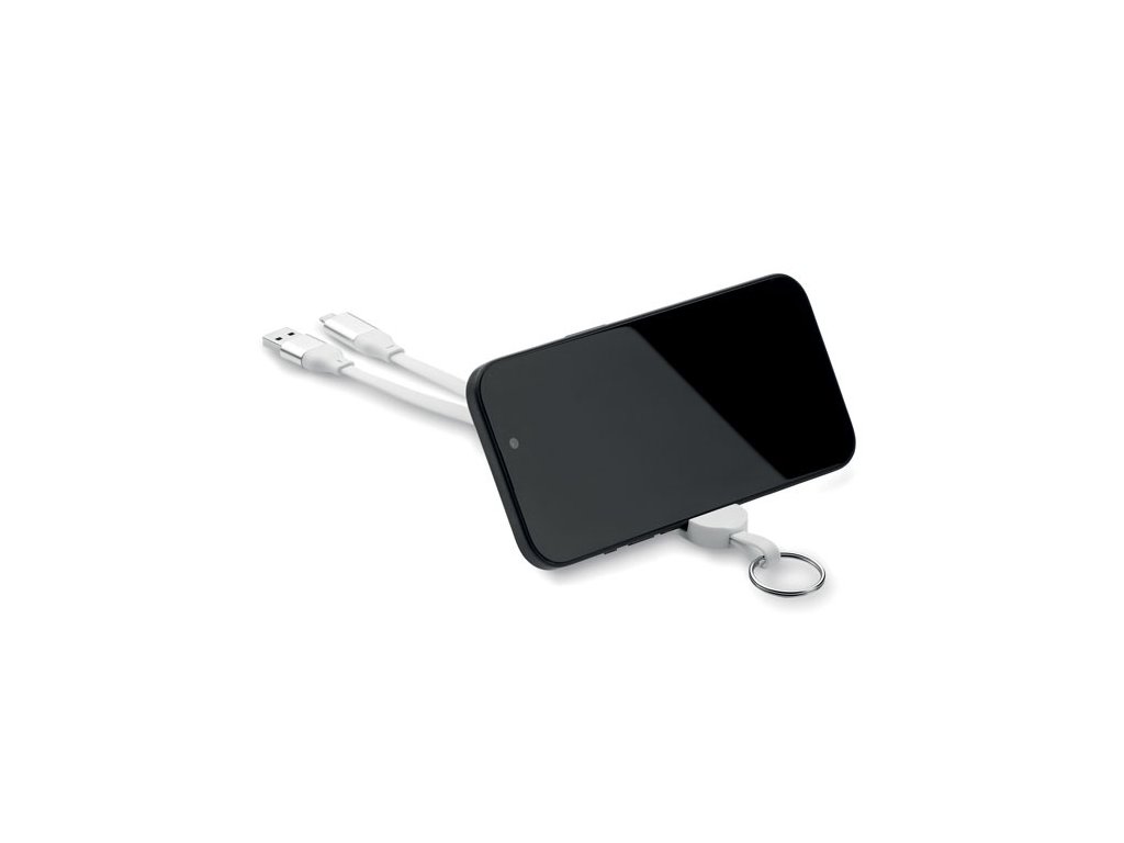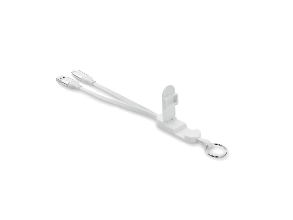 60W kábel v recyklovanom ABS obale s príveskom na kľúče a stojanom na telefón. Vstup: 2 v 1 typu C a typu A. Výstup: Type-C a micro-B (2v1 pin). Dĺžka kábla: 26 cm.