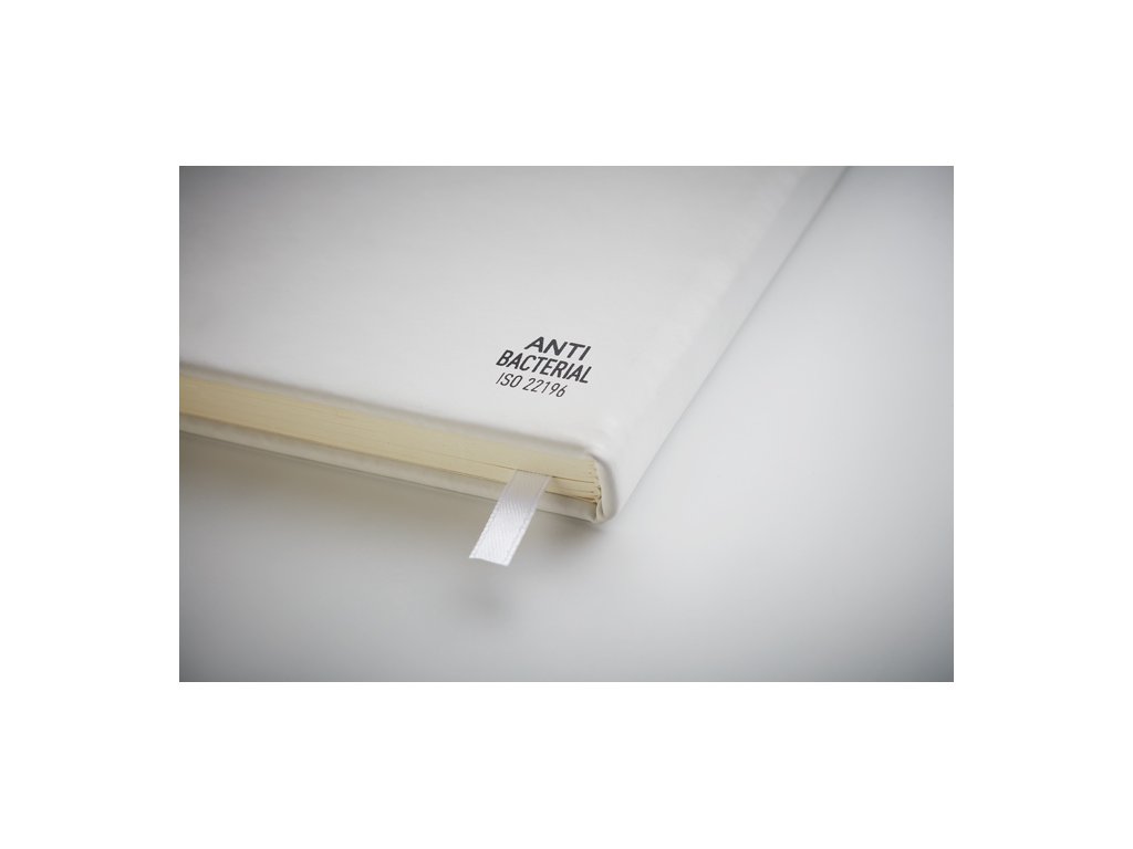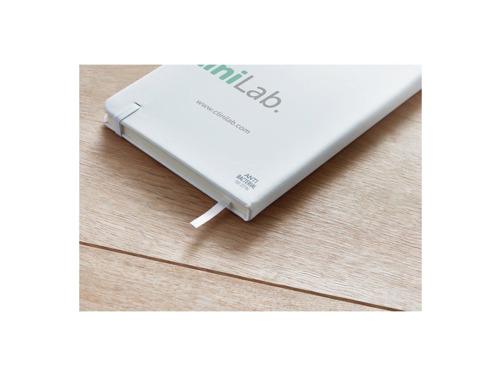 zápisník a5 s antibakteriálnou obálkou z mäkkého pu. 96 linkovaných stránok (70 gr). zatváranie pomocou gumičky. ISO 22196.