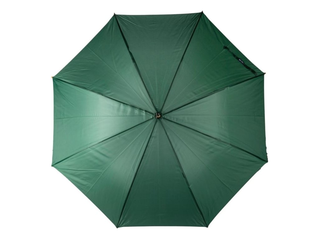 Automatický golfový dáždnik z rPET 190T s ôsmimi panelmi a bambusovou rukoväťou. Bambusová a oceľová tyč s kovovým rámom. Súčasťou balenia je zapínanie na suchý zips a štítok z rPET.