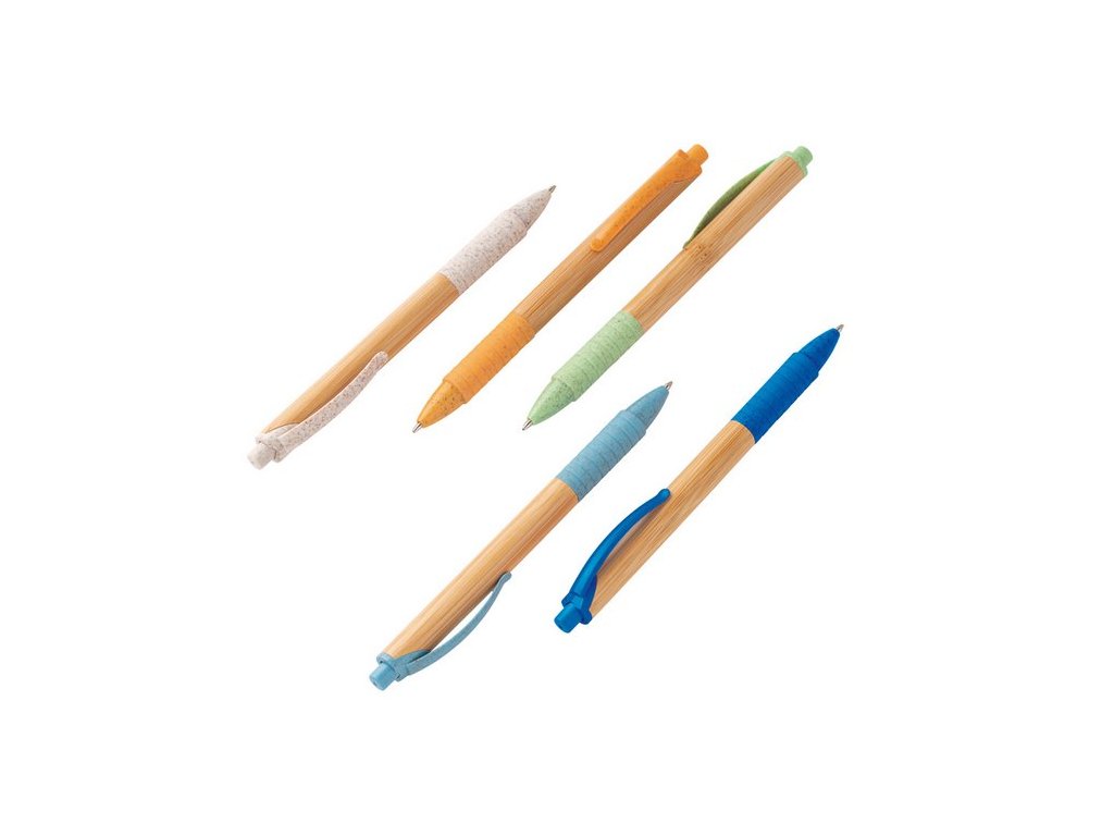Bambusové guľôčkové pero so sponou, protišmykovou rukoväťou a farebnými prvkami z pšeničných vlákien a ABS. The additional information presented is indicative and may vary