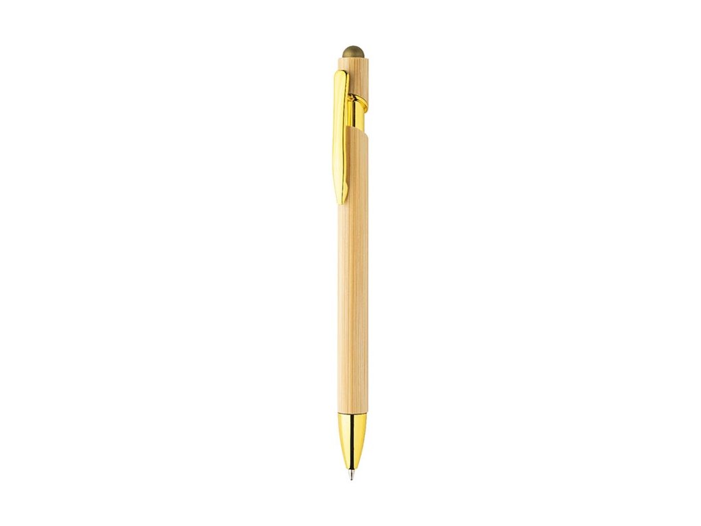 Bambusové dotykové guľôčkové pero s lesklými kovovými detailmi a farebným dotykovým stylusom. S modrou náplňou.
