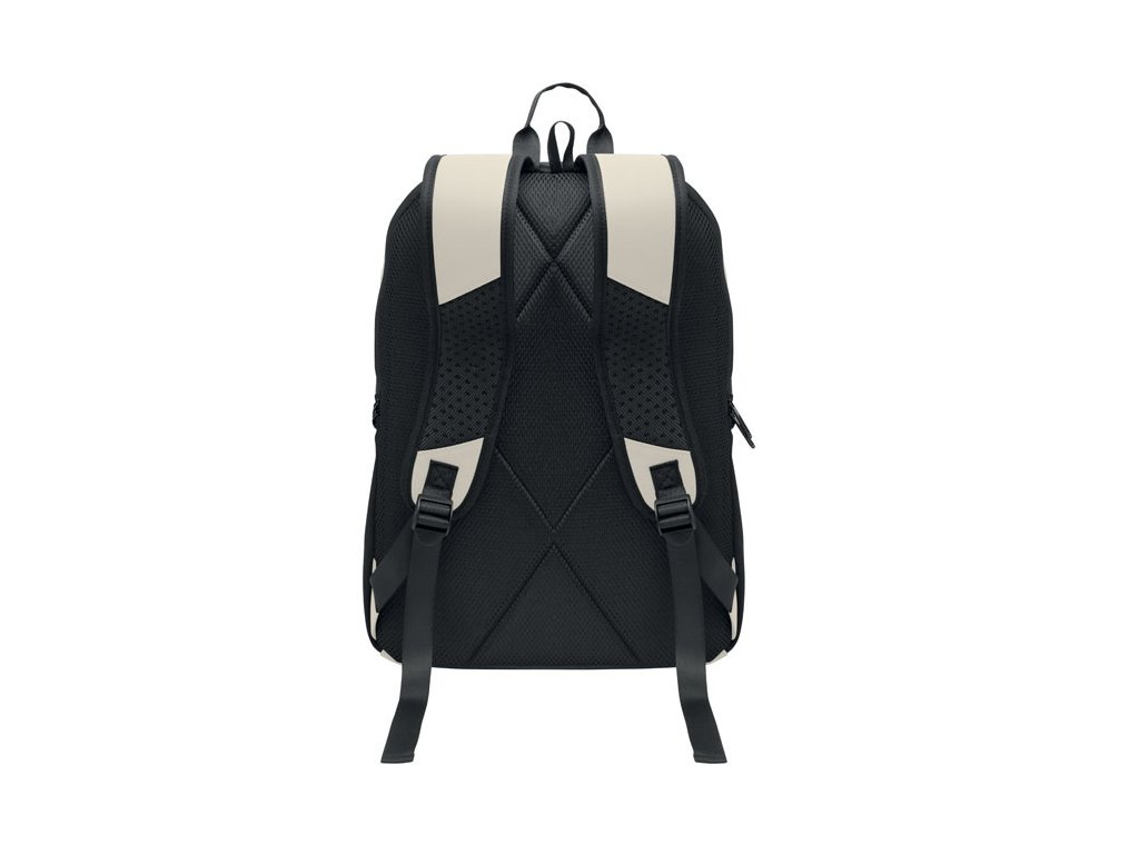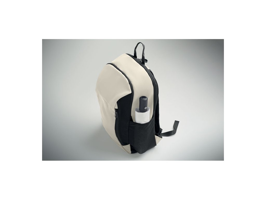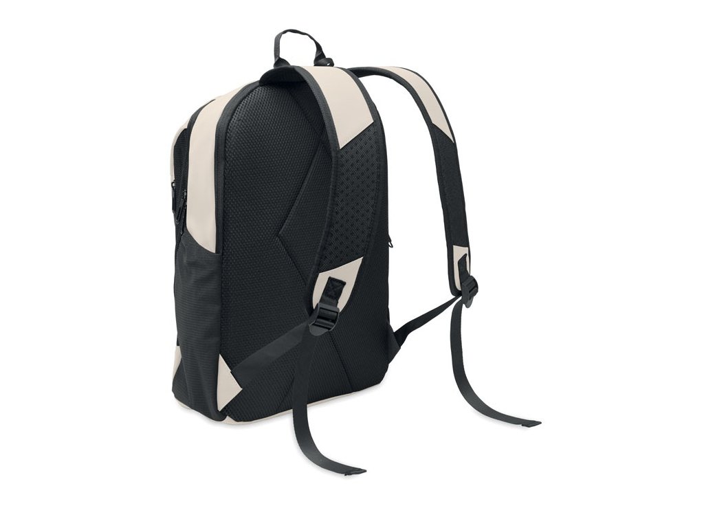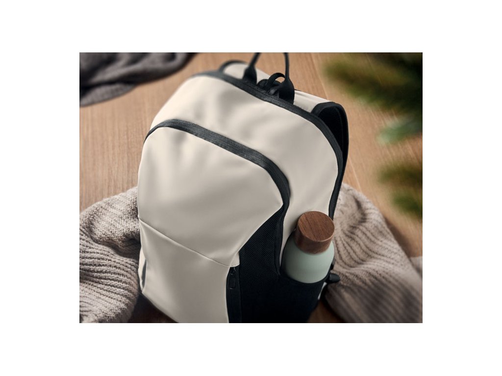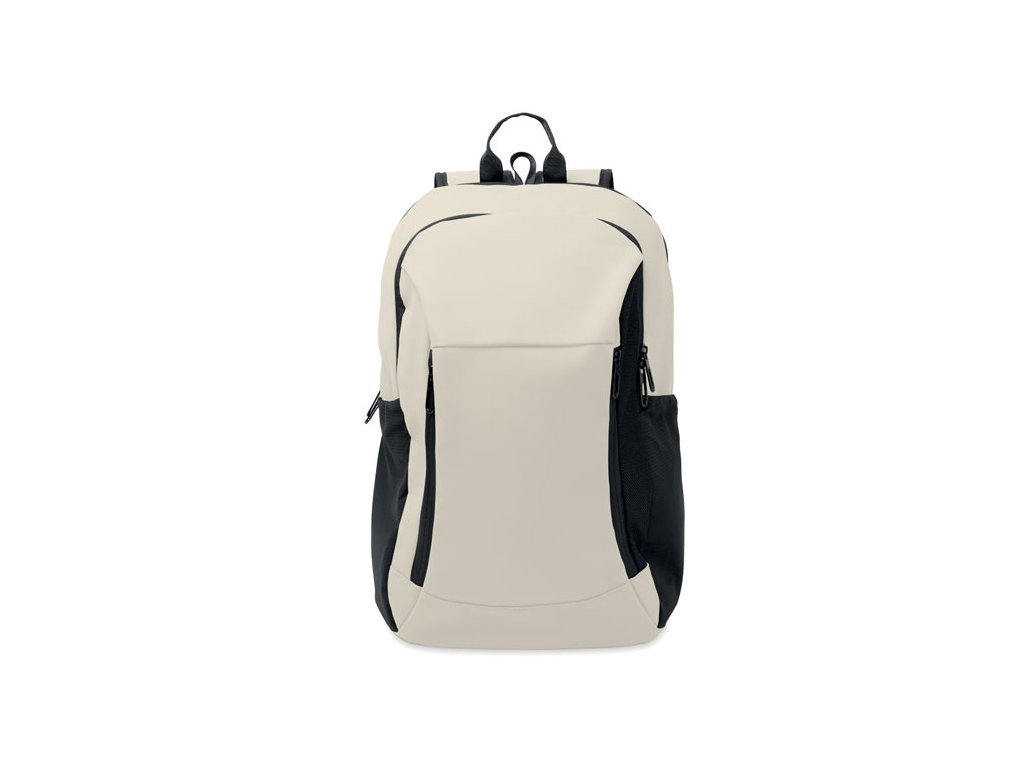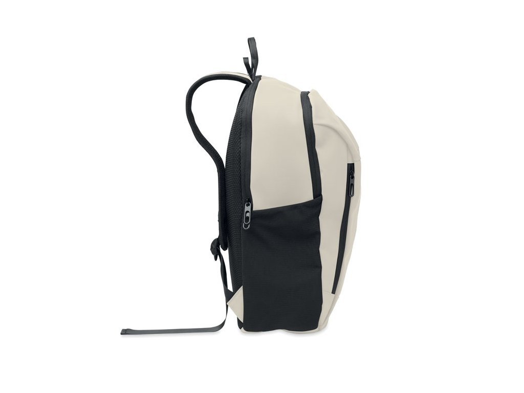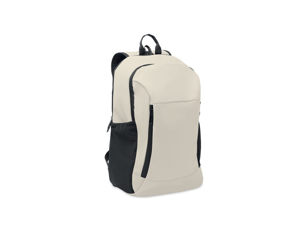 15-palcový batoh na notebook z mäkkej PU tkaniny s polstrovaným chrbtom a skrytým hlavným priestorom na zips. 1 predné vrecko na zips, 2 bočné vrecká na zips vpredu a 2 bočné vrecká z elastickej sieťoviny. S podšívkou z 210D RPET.