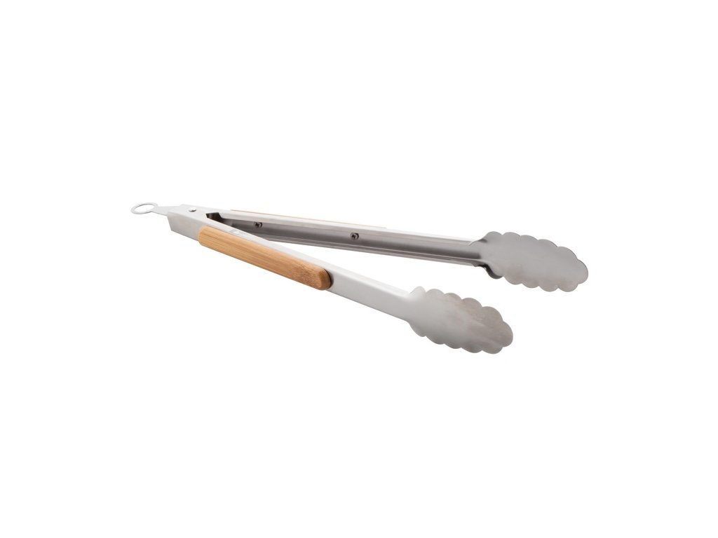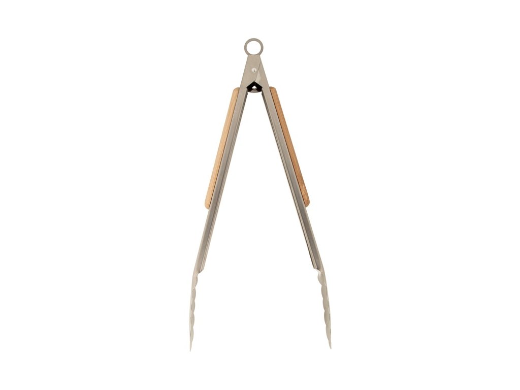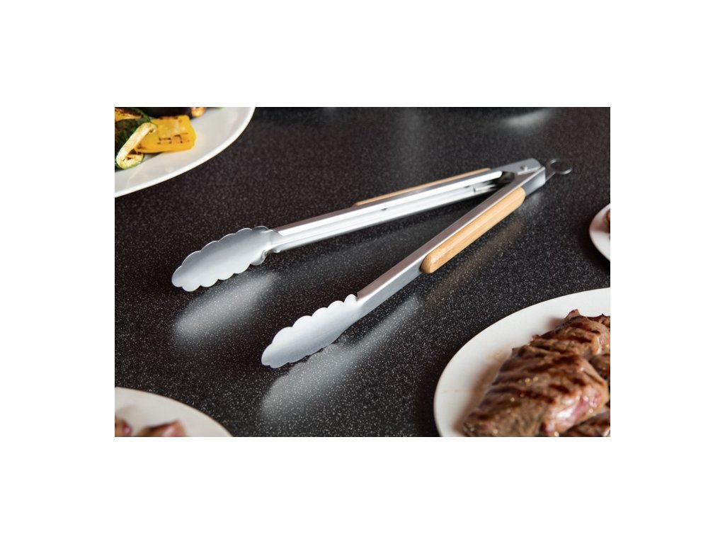 Nerezové kliešte na grilovanie s bambusovými držadlami a uzamykacím mechanizmom.