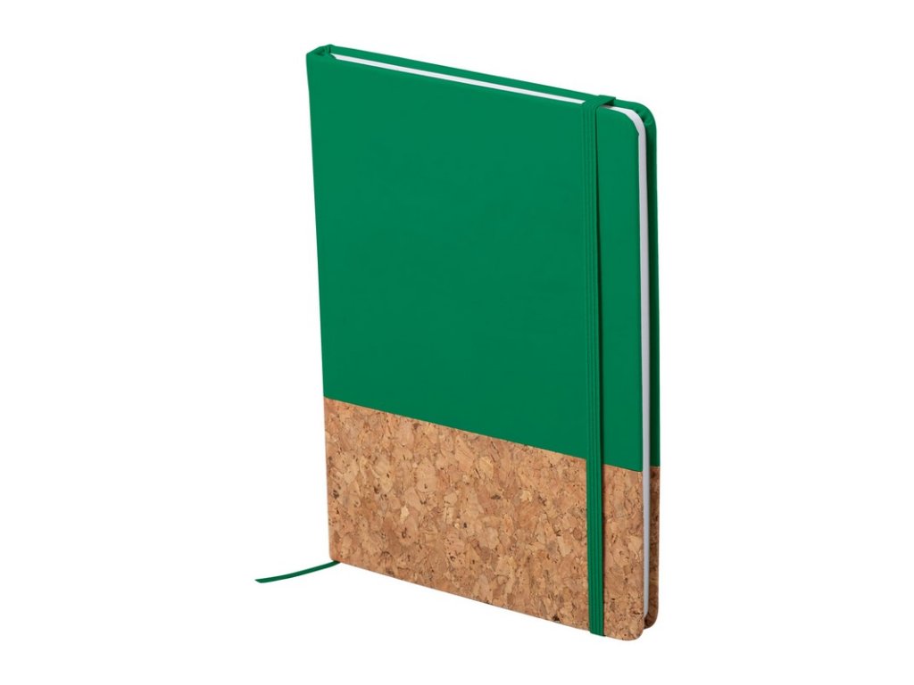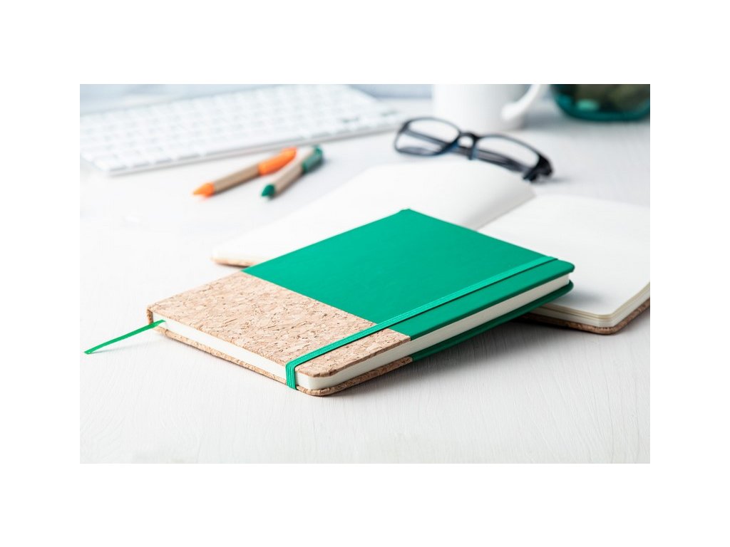 Blok A5 s doskami z prírodného korku a PU kože, s gumičkou a 98 čistými listami.