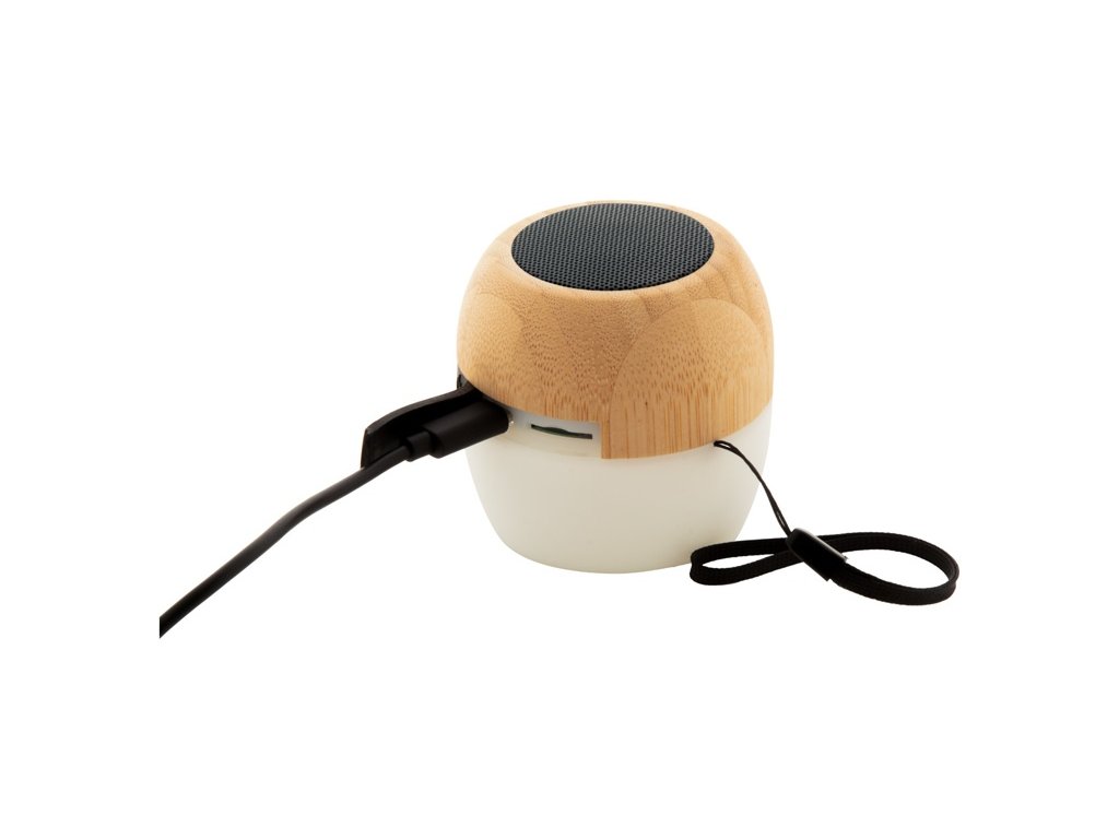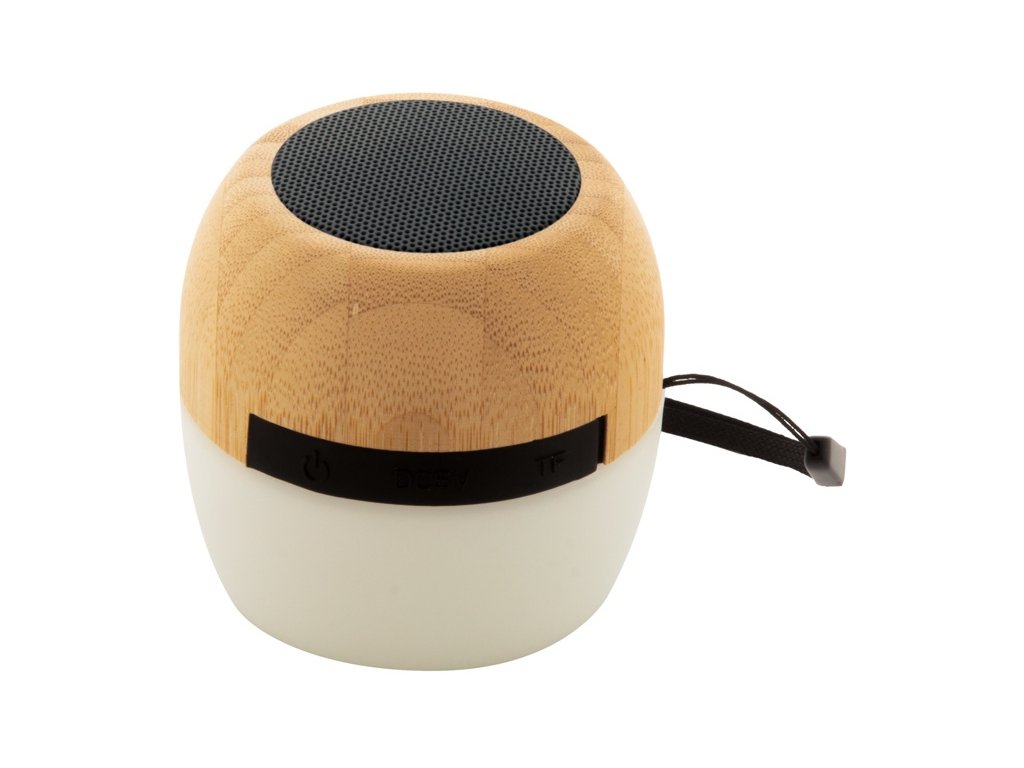 Bluetooth reproduktor v puzdre z recyklovaného ABS plastu a bambusu s viacfarebným LED svetlom na spodnej strane. S popruhom a vstavanou dobíjacou batériou. Vrátane USB nabíjacieho kábla.