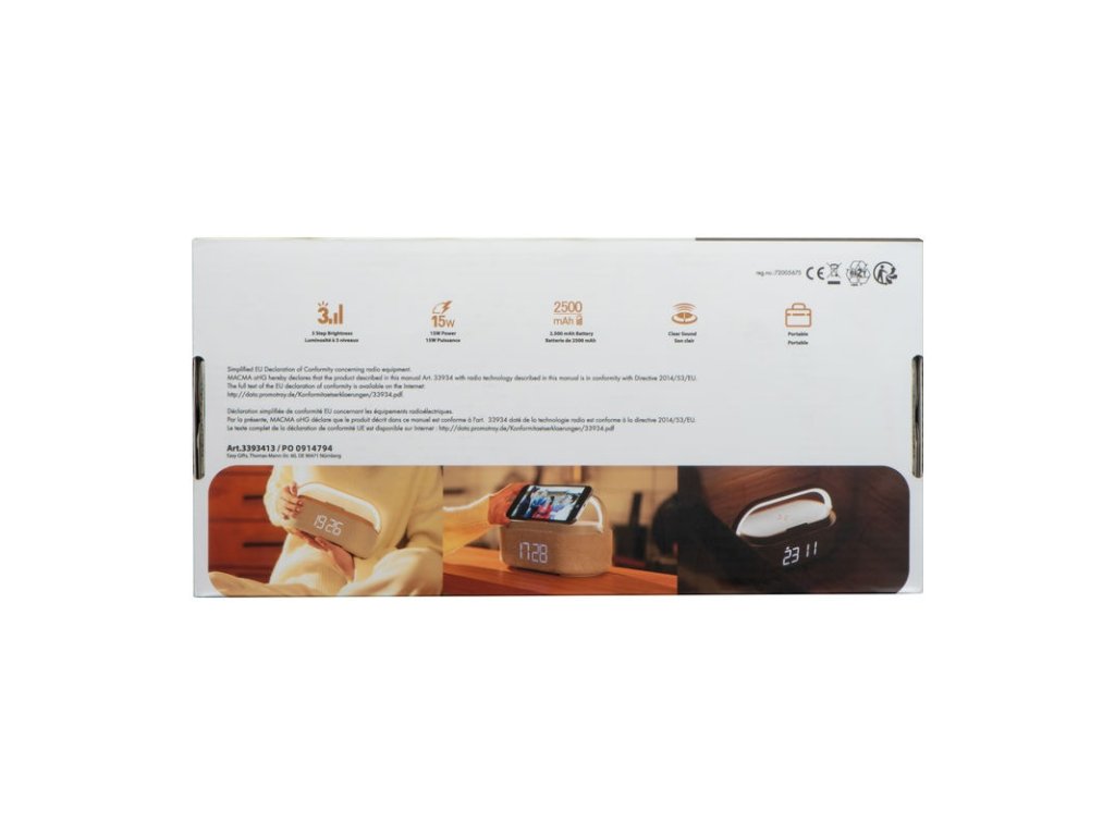 Reproduktor má funkciu bezdrôtového nabíjania. Integrovaný digitálny displej zobrazuje čas a ďalšie informácie. 2000 mAh batéria, integrované rádio, držiak na smartfón, budík, stmievateľná lampa (3 režimy).