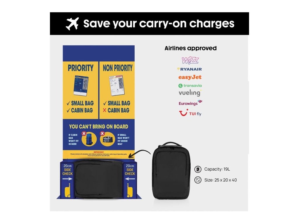 Nastaviteľné ramenné popruhy a predné vrecko na zips pre rýchly prístup. Batoh spĺňa požiadavky na maximálnu veľkosť bezplatnej príručnej batožiny u nízkonákladových spoločností. AWARE™. Neobsahuje PVC.