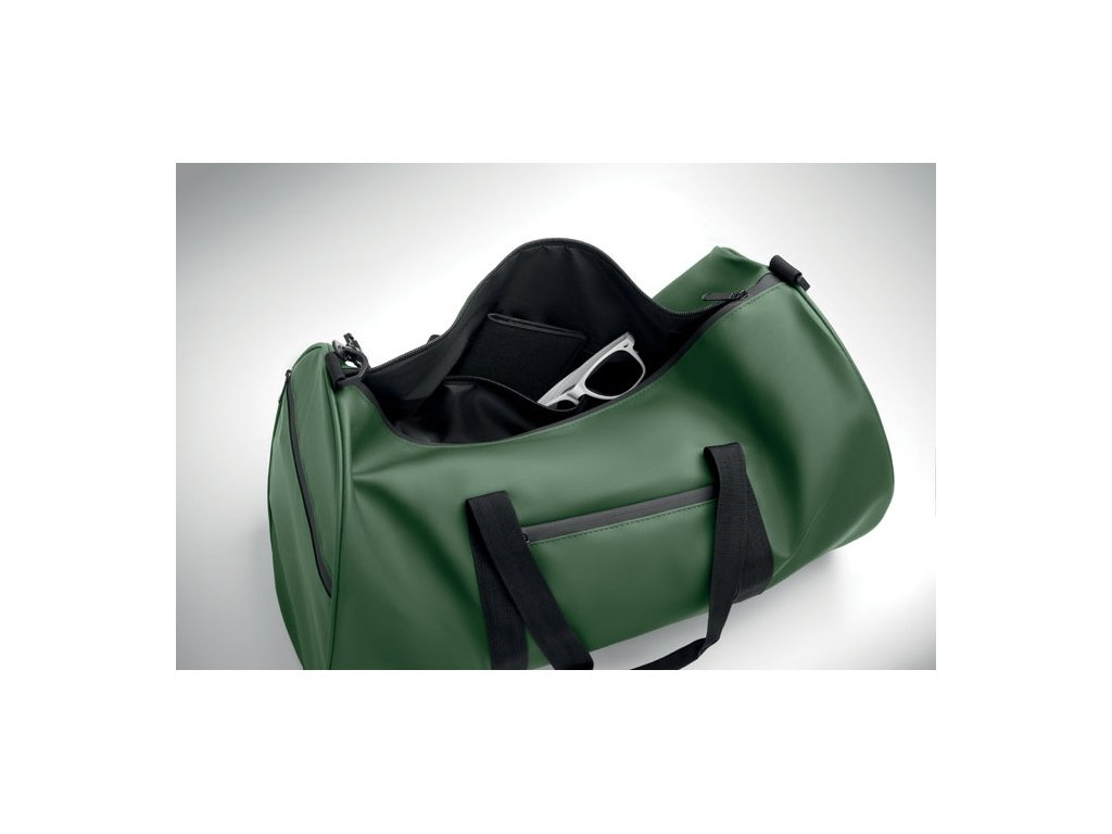 Cestovná taška z 600D RPET polyesteru s PU záterom. Predné vrecko na zips. Vnútorná podšívka z 210D RPET polyesteru. 1 bočné vrecko na zips / 1 bočné sieťované vrecko. Vnútorné vrecko na zips.