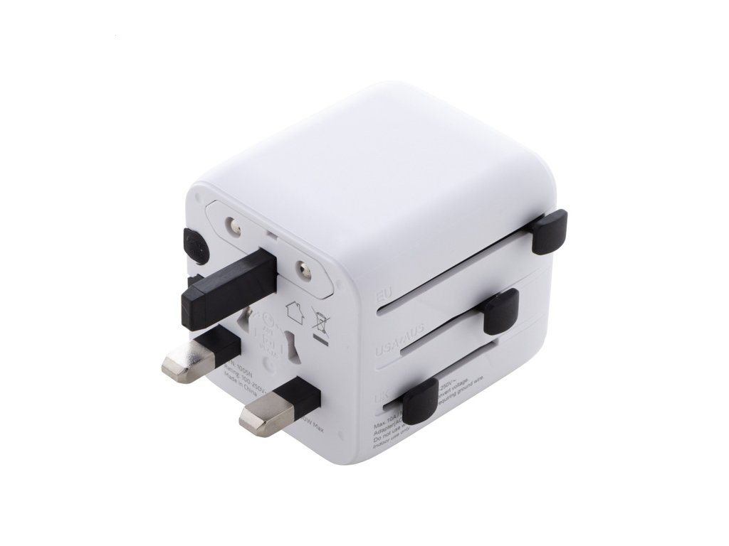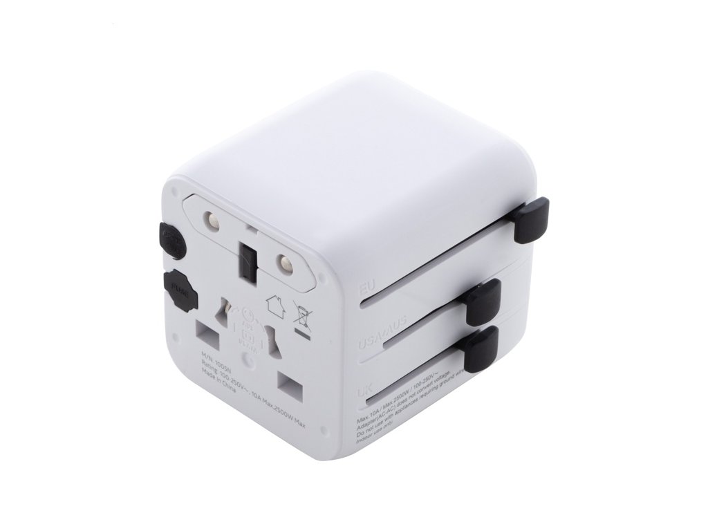 Ultra kompaktný, univerzálny celosvetový cestovný adaptér z recyklovaného PC plastu, so zabudovanými zástrčkami pre USA, Európu, Veľkú Britániu a Austráliu.