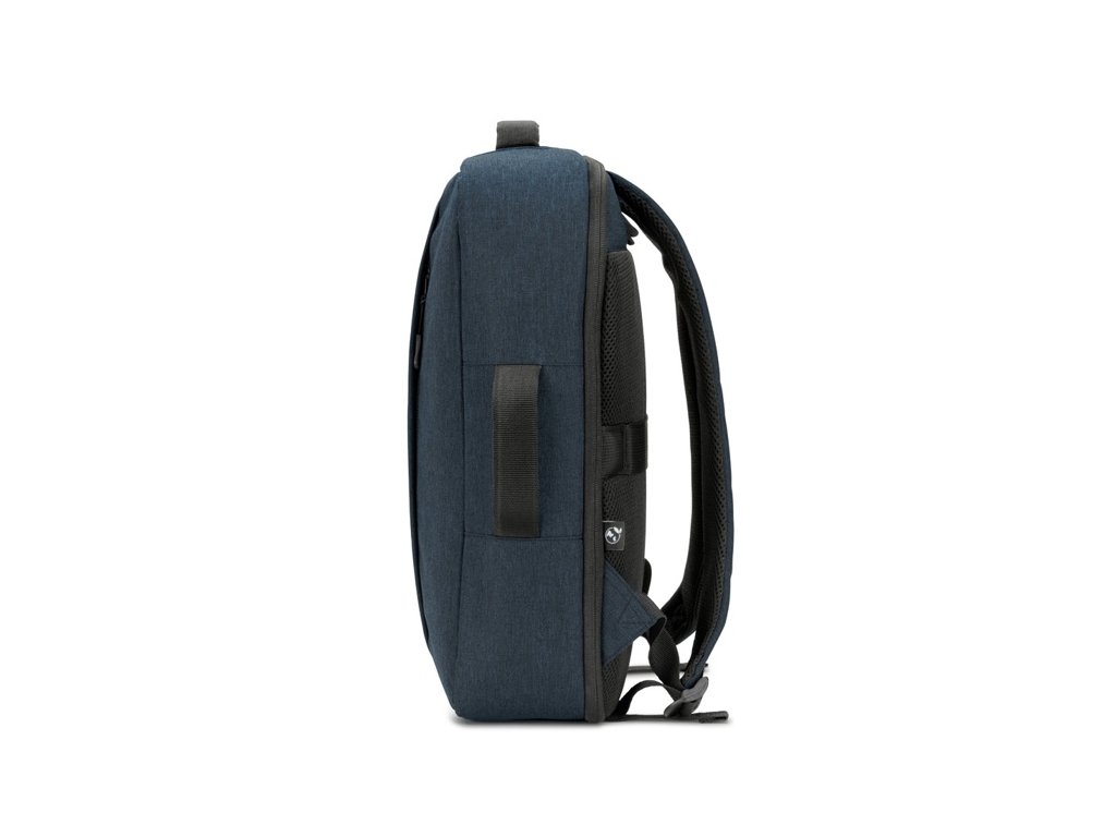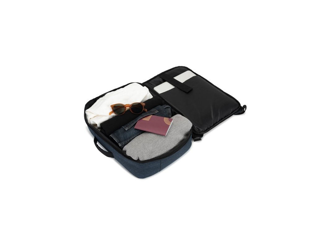 Batoh z 300D RPET a podšívky zo 190T RPET. Hlavný priečinok na laptopy do 15.6", ktorý sa dá úplne otvoriť, a veľké predné vrecko. Batoh sa dá použiť aj ako aktovka vďaka bočnému držadlu. Sieťovaný chrbát obsahuje popruh na kufor. Kapacita až 15 L.