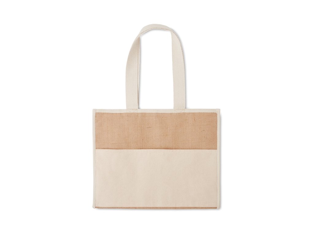 nákupná taška z juty s dlhými držadlami, laminovaná a so zapínaním na suchý zips. na prednej strane plátená vrecko. bavlnený popruh.