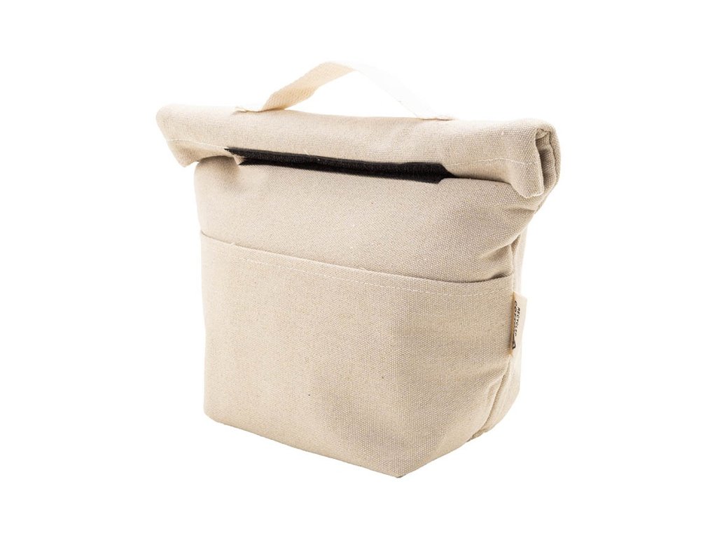 Chladiaca taška z recyklovaného plátna s rolovacím vrchom, predným vreckom, hliníkovou výplňou a zapínaním na suchý zips. 70 % recyklovanej bavlny a 30 % polyesteru RPET. S výrazným štítkom z recyklovanej bavlny.
