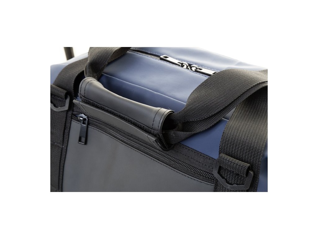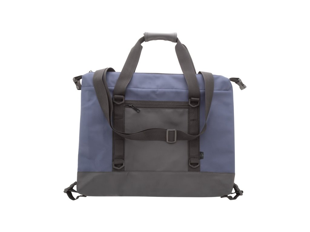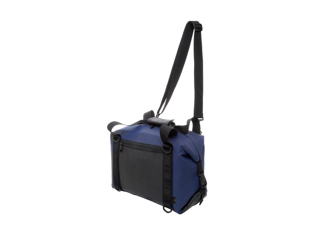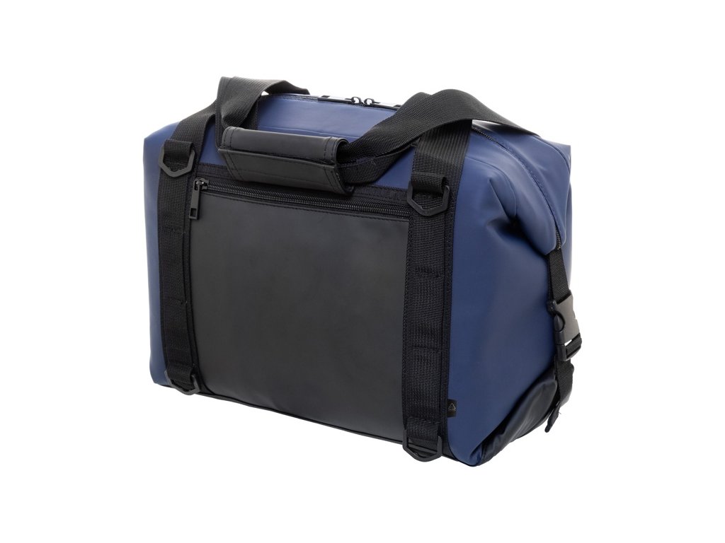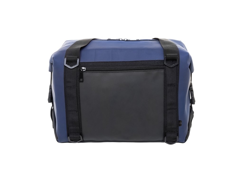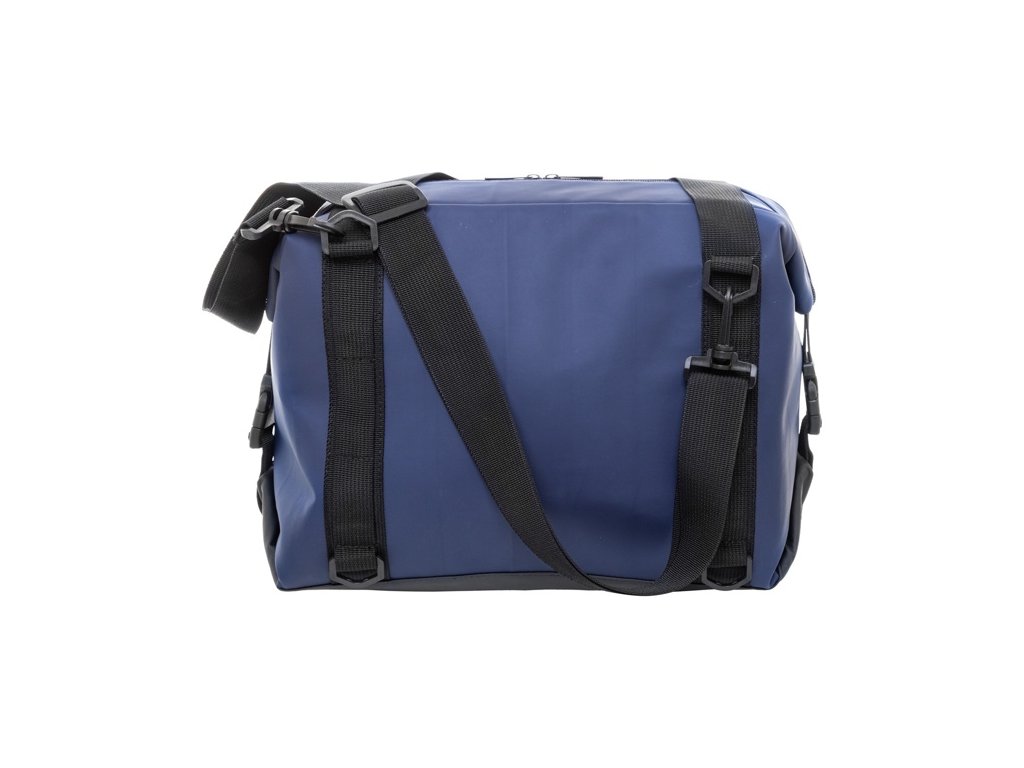 Skladacia chladiaca taška na zips z mäkkej recyklovanej PU kože s hliníkovou výplňou a predným vreckom na zips. S bočnými prackami, držadlami a nastaviteľným popruhom. Možné zložiť naplocho pre ľahké skladovanie alebo ju zaistiť pomocou bočných výstuh.