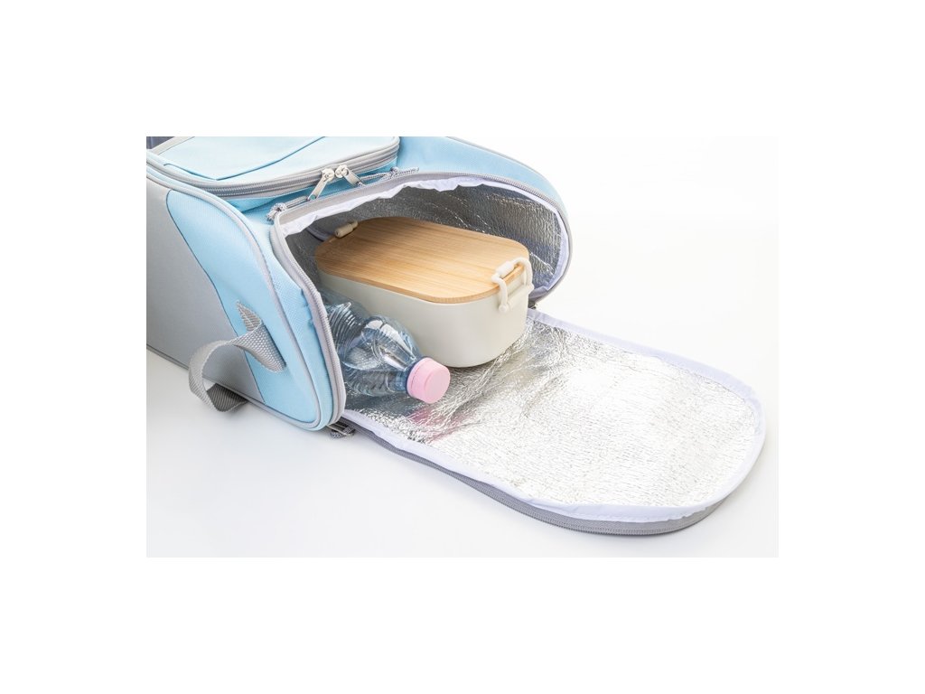 Chladiaca taška RPET s hliníkovým polstrovaním. S 2 priehradkami na zips, malým predným vreckom a nastaviteľným ramenným popruhom. 600D RPET polyester s výrazným štítkom RPET.