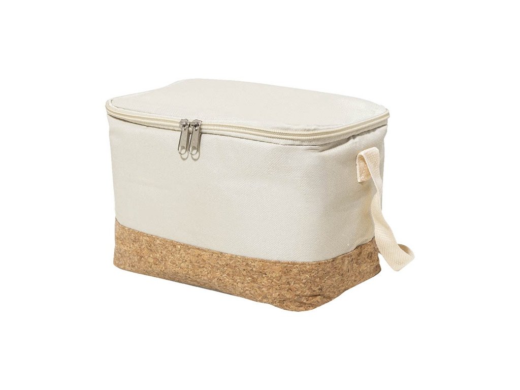 Chladiaca taška na zips z 600D RPET polyesteru s prírodnou korkovou základňou, PEVA polstrovaním a nastaviteľným ramenným popruhom. S výrazným štítkom RPET.