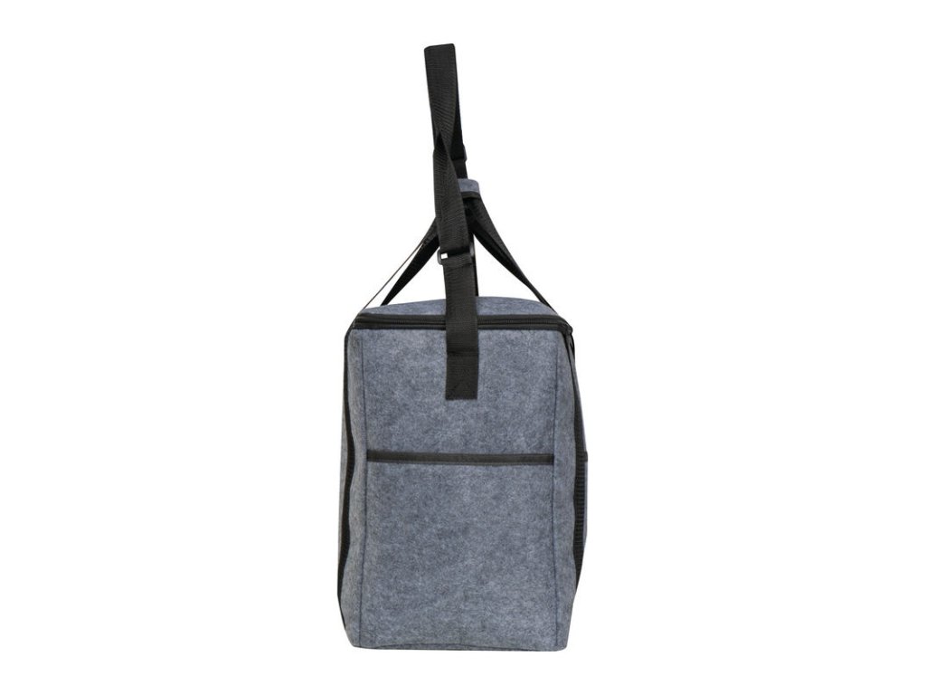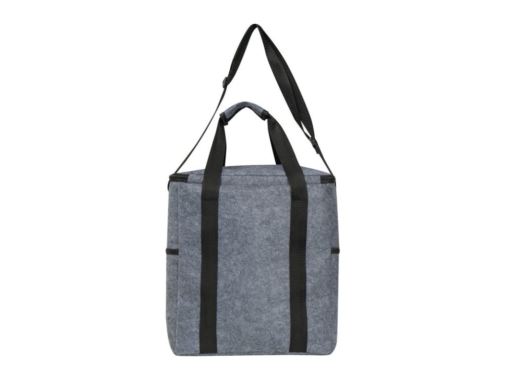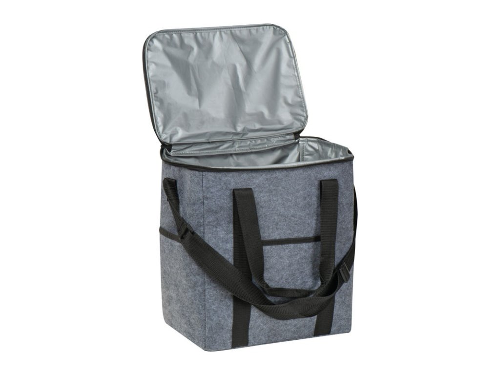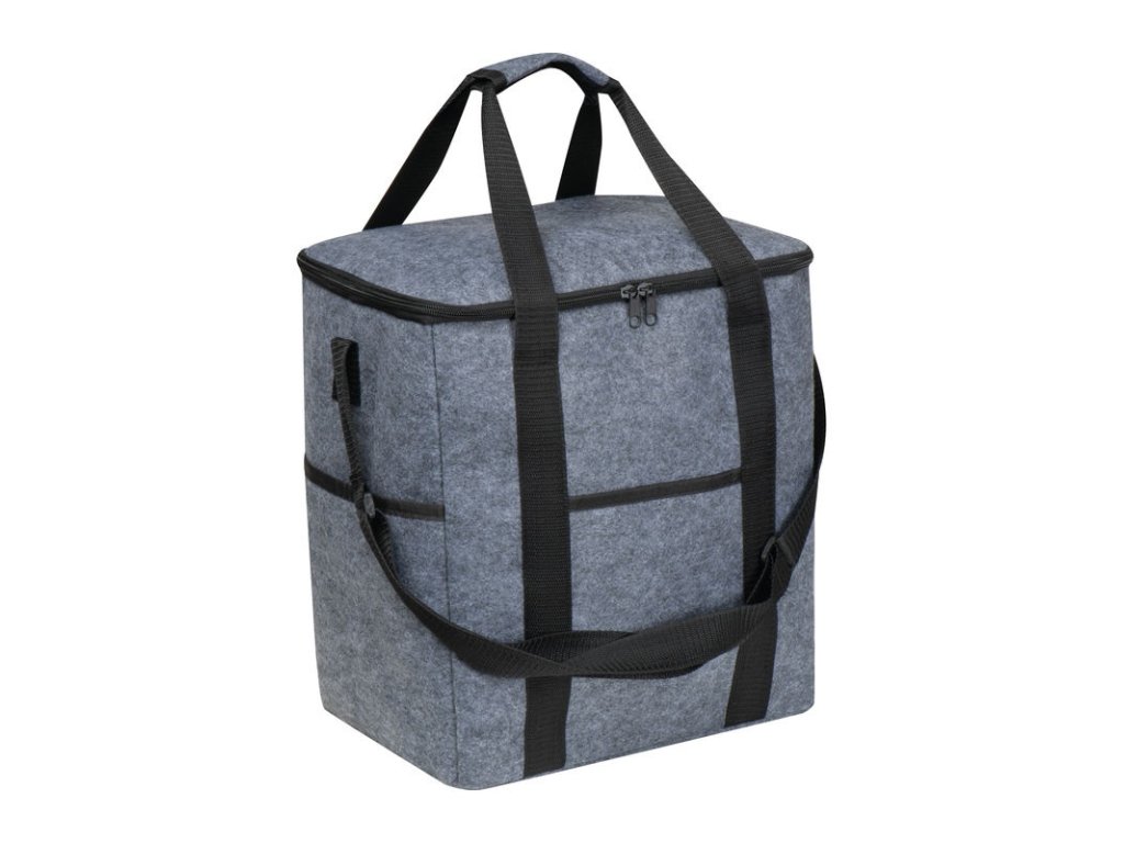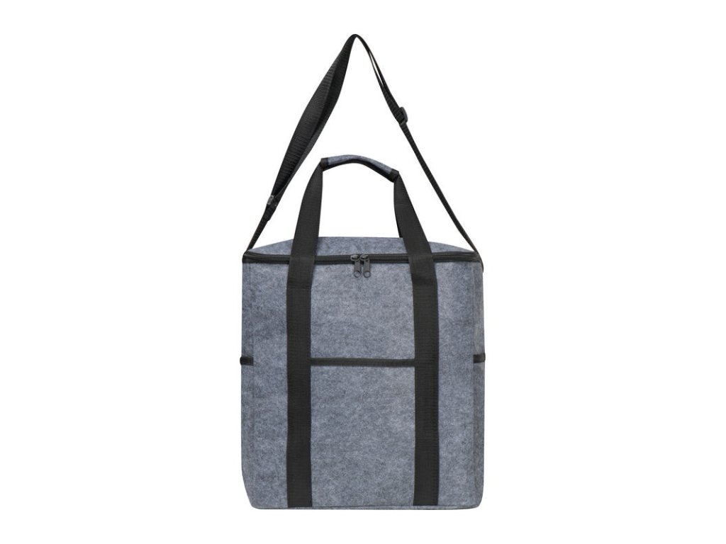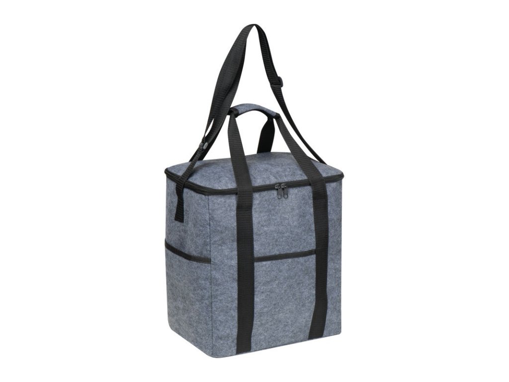 Chladiaca taška z recyklovanej plsti s vnútorným priečinkom, dvoma vonkajšími bočnými priečinkami a priečinkom na prednej strane. Udržateľná a praktická na cesty.