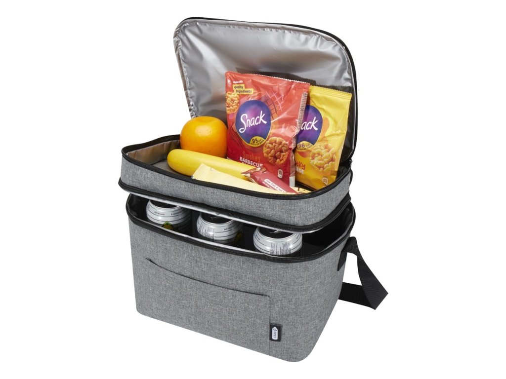 Chladiaca taška Tundra má hornú priehradku na zips, priestrannú hlavnú priehradku a nastaviteľné ramenné popruhy. Vyrobené z PEVA podšívky a recyklovaného polyesteru s certifikáciou GRS. Objemová kapacita: 13 litrov.
