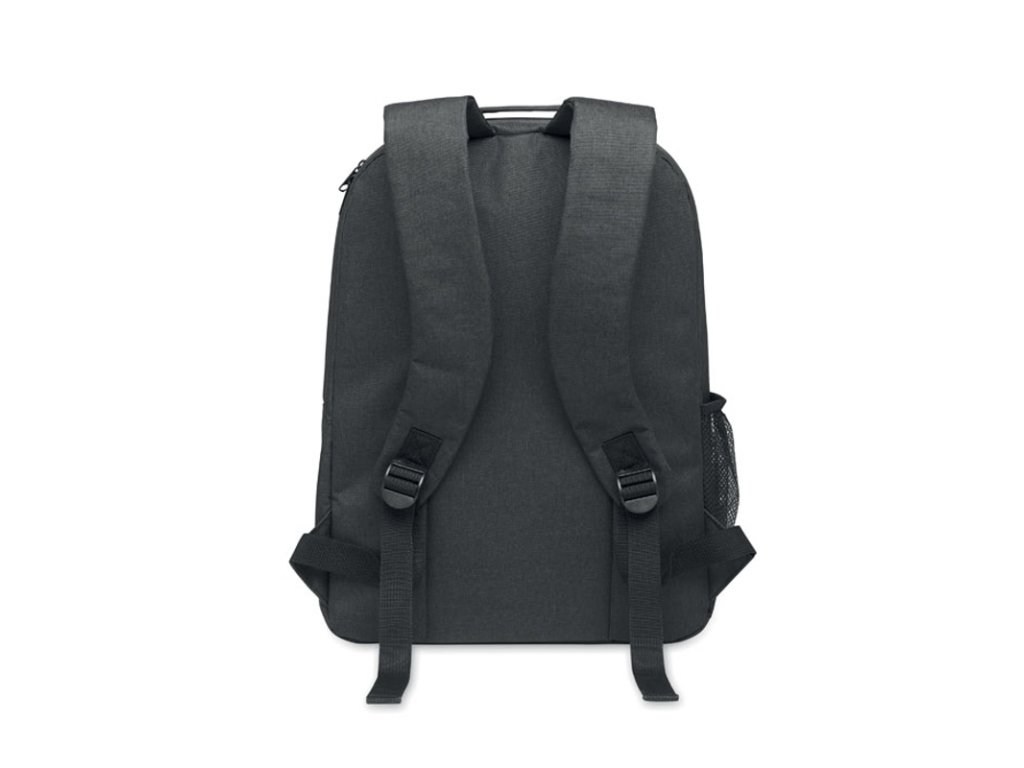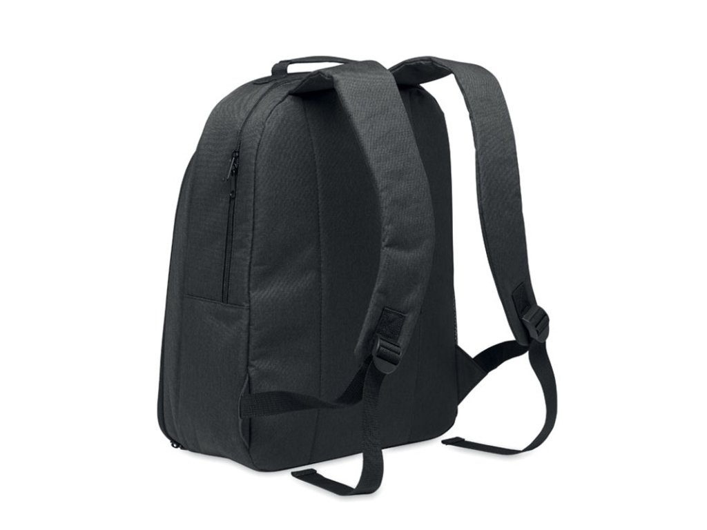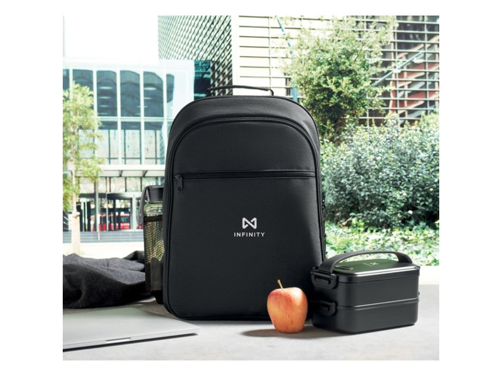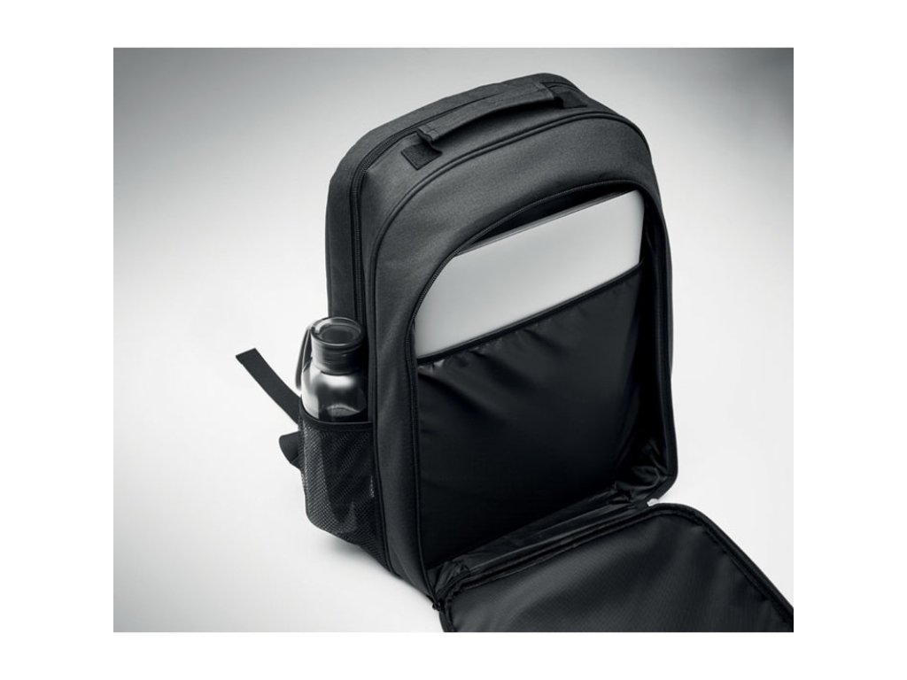 Chladiaci batoh z 300D RPET s priehradkou na 15-palcový notebook. Predné vrecko na zips a jedna bočná priehradka zo sieťoviny.