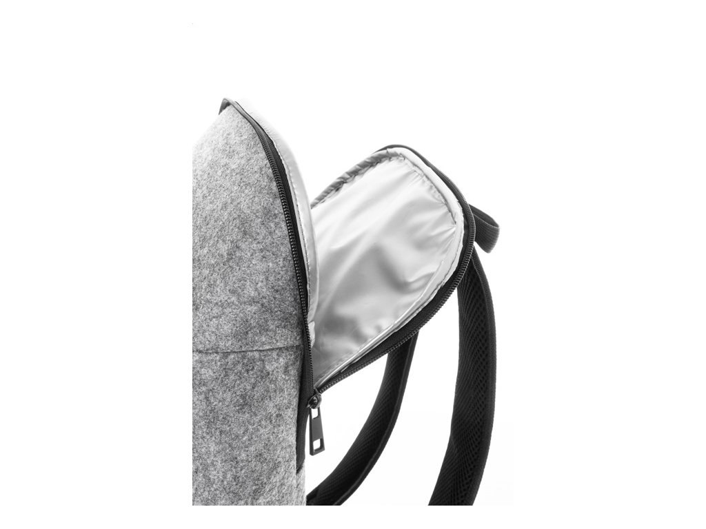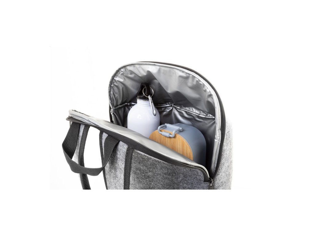 RPET plstený chladiaci batoh s PEVA výstelkou. S polstrovanými ramennými popruhmi, hlavnou priehradkou na zips a predným vreckom.
