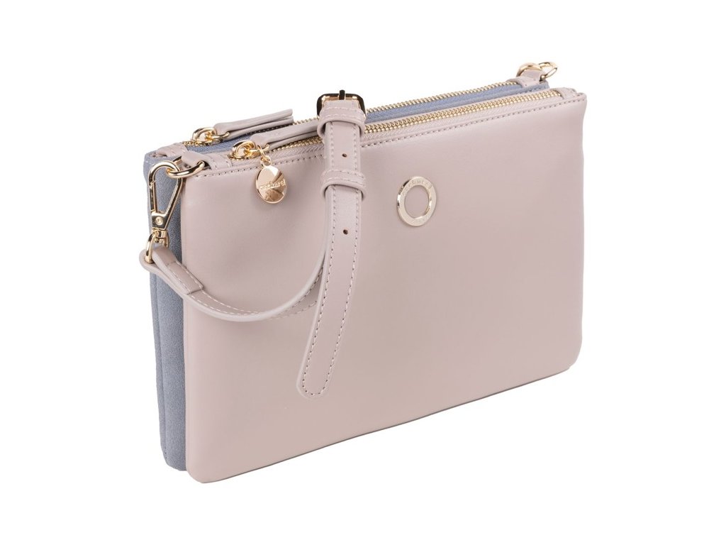 Kabelka Alix od Cacharel má dve časti spojené dohromady, s prírodným semišom. Každá časť má zapínanie na zips a dlhý ramenný popruh. Kovový krúžok v strede čiernej priehradky s vyrytým logom Cacharel dodáva dizajnu nádych luxusu.