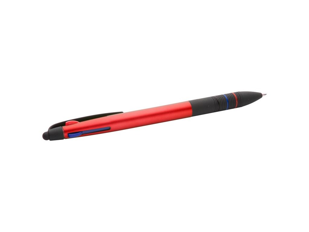 Plastové guľôčkové a dotykové pero s pogumovaným úchopom a telom s matnou metalickou úpravou. Tri farebné náplne: modrá, čierna a červená.