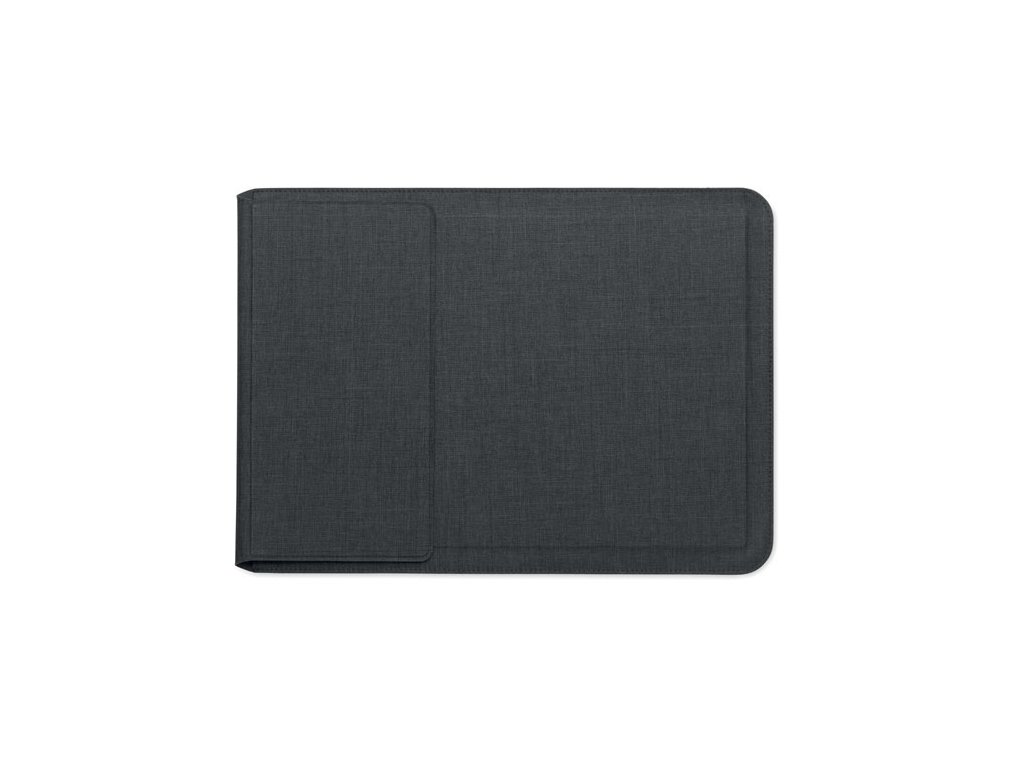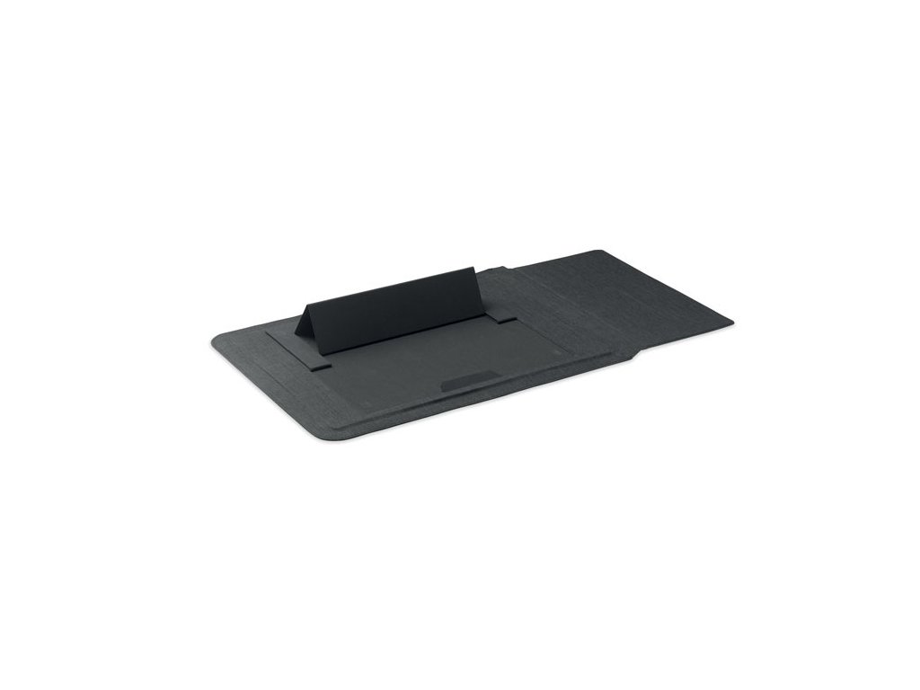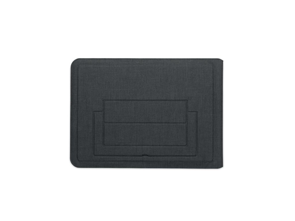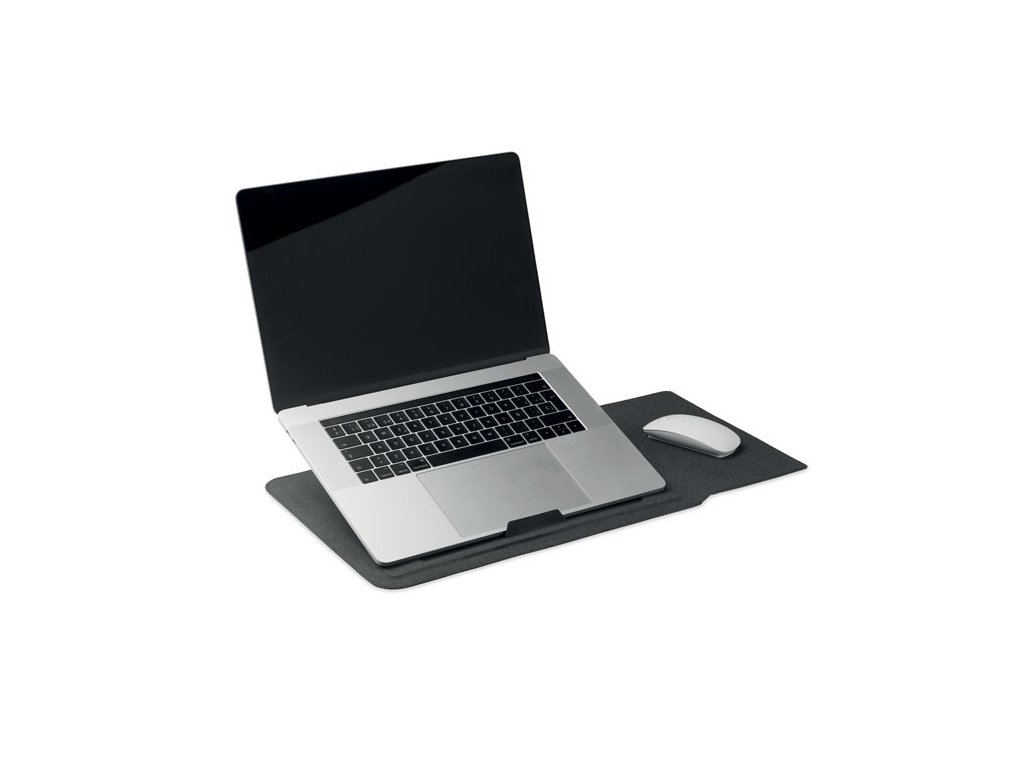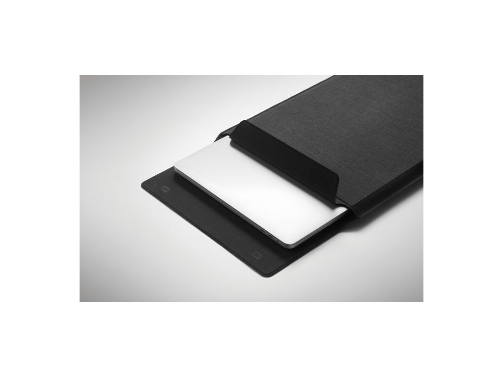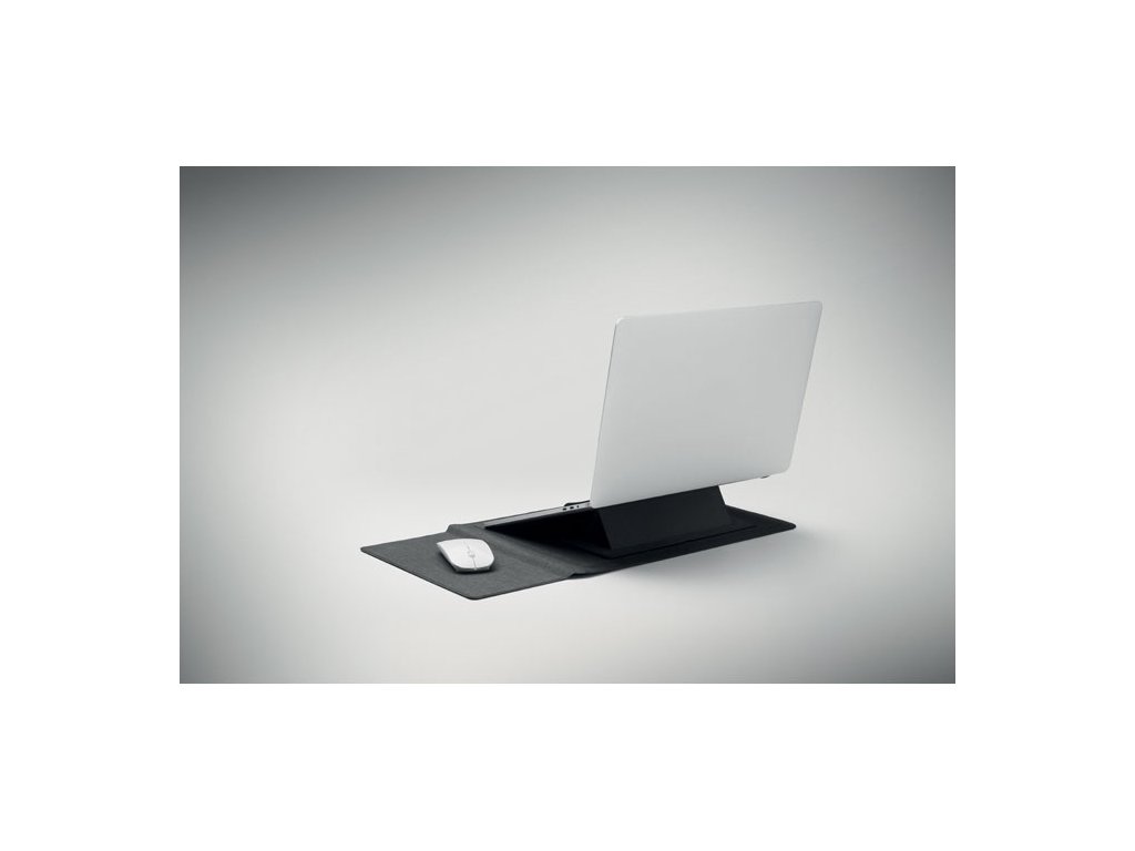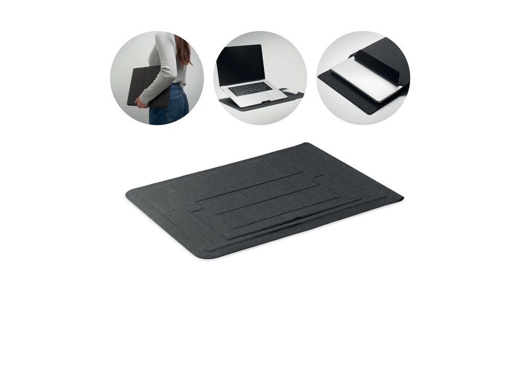 Puzdro na notebook 3v1 z RPET s rozmerom 16 palcov, stojanom na notebook a podložkou pod myš v rozloženom stave.