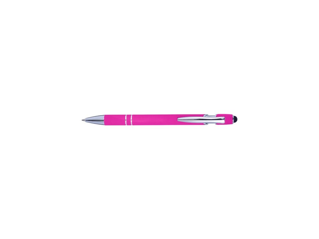 Hliníkové guľôčkové pero s gumovým poťahom a gumovou špičkou pre kapacitné sitá. Špička a spona sú z plastu striebornej farby. Modrý atrament.