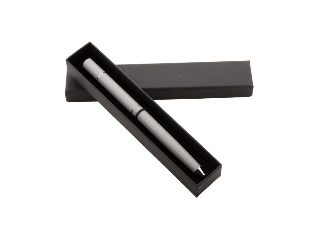 2v1 kovové guľôčkové pero a bezatramentové v čiernej darčekovej krabičke. S modrou náplňou a hrotom z kovovej zliatiny, ktorá oxiduje papier.
