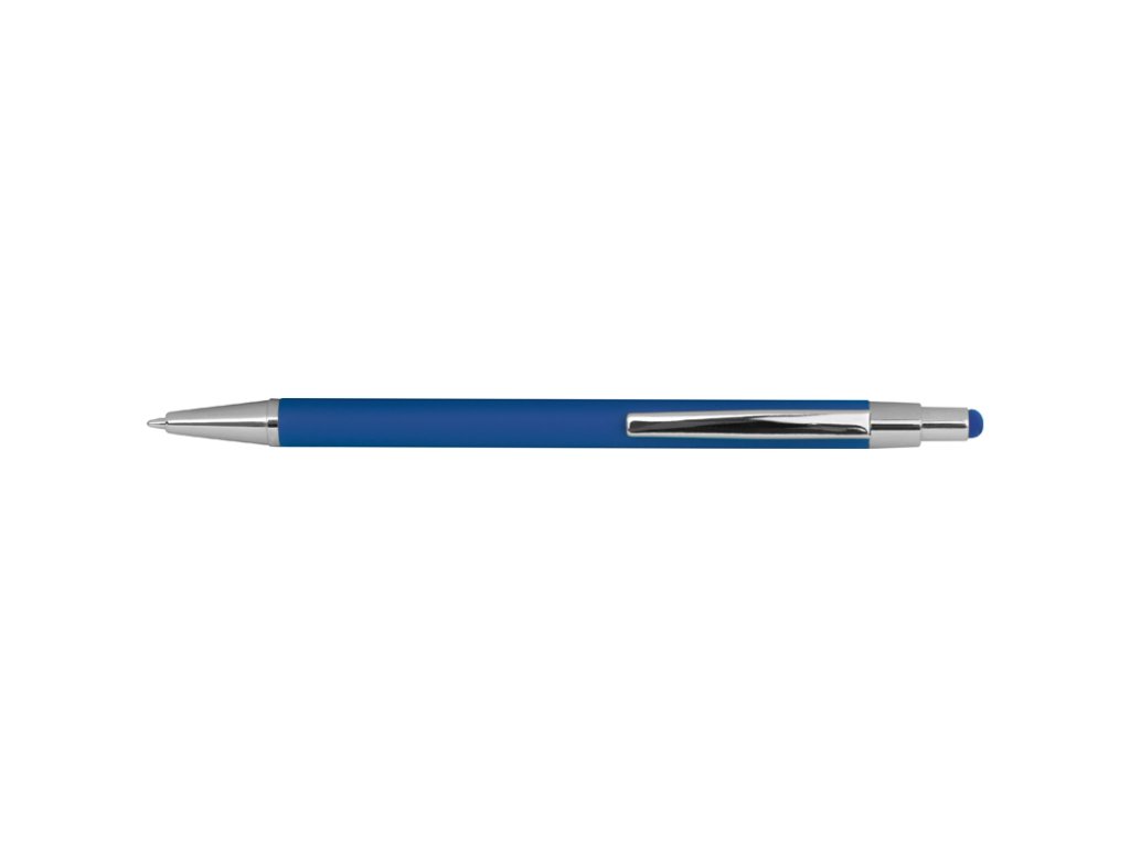 Tenké kovové guľôčkové pero s gumeným povrchom, modrou náplňou a stylusom.