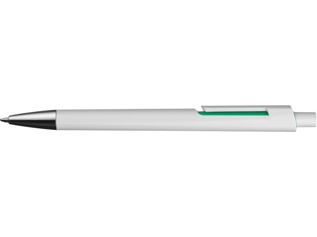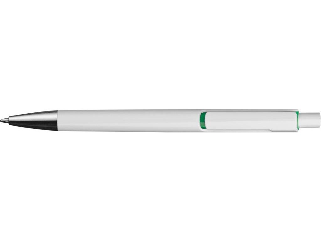 Biele plastové guľôčkové pero s farebnými časťami a jumbo náplňou. Pero má modrý atrament.