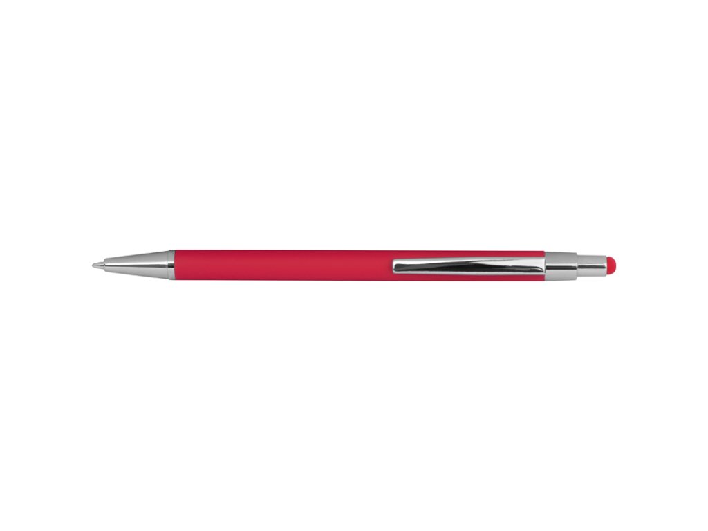 Tenké kovové guľôčkové pero s gumeným povrchom, modrou náplňou a stylusom.