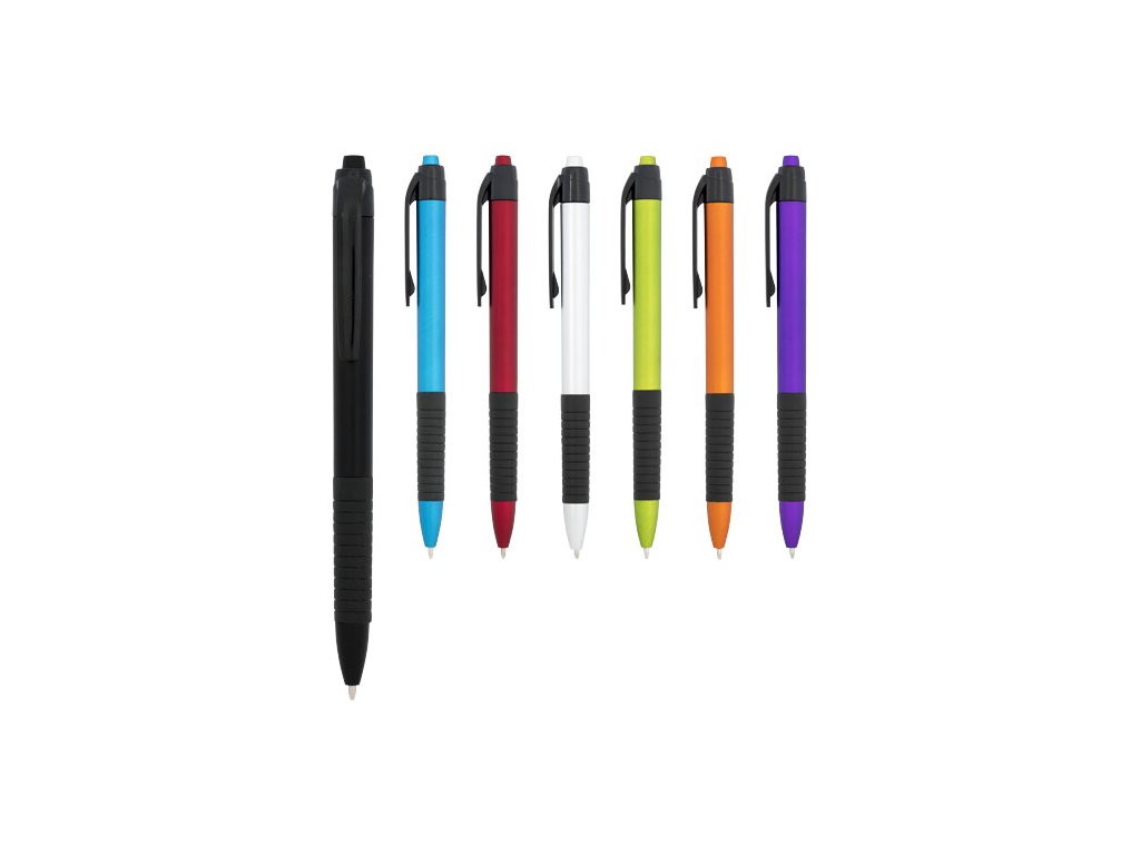 Guľôčkové pero s prítlačným mechanizmom, s metalizovanou povrchovou úpravou a s pogumovaným úchopom. Pero má modrý atrament.