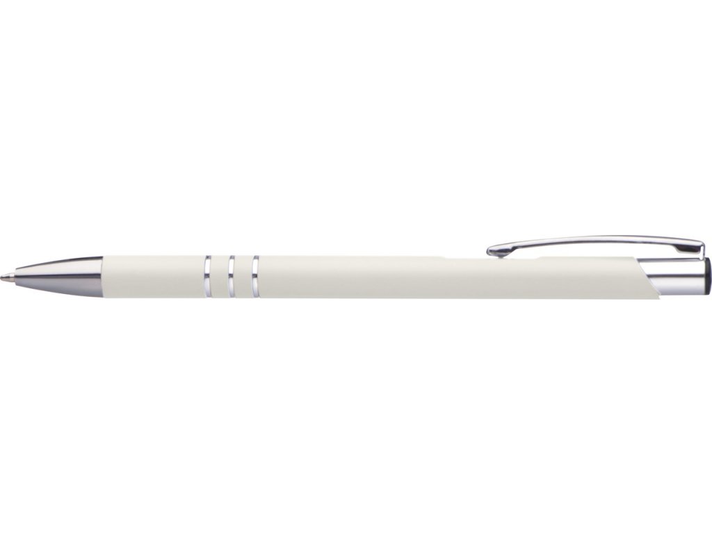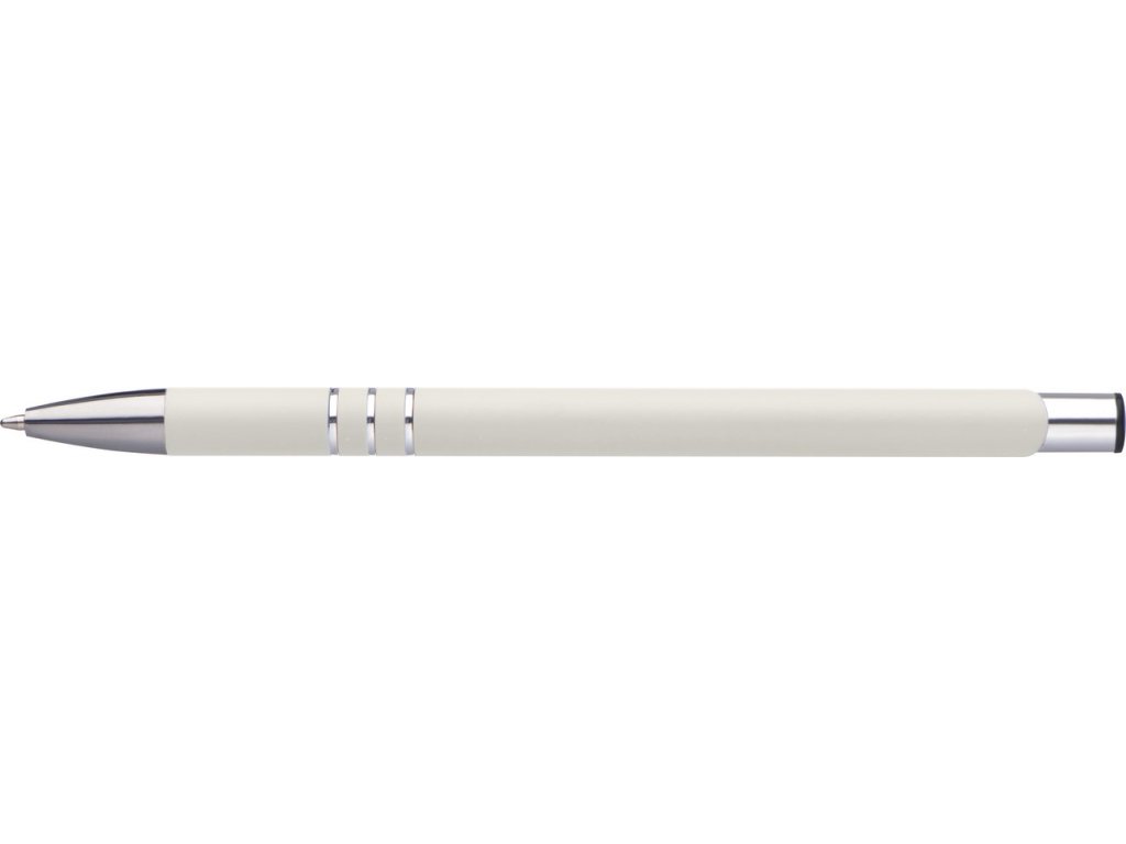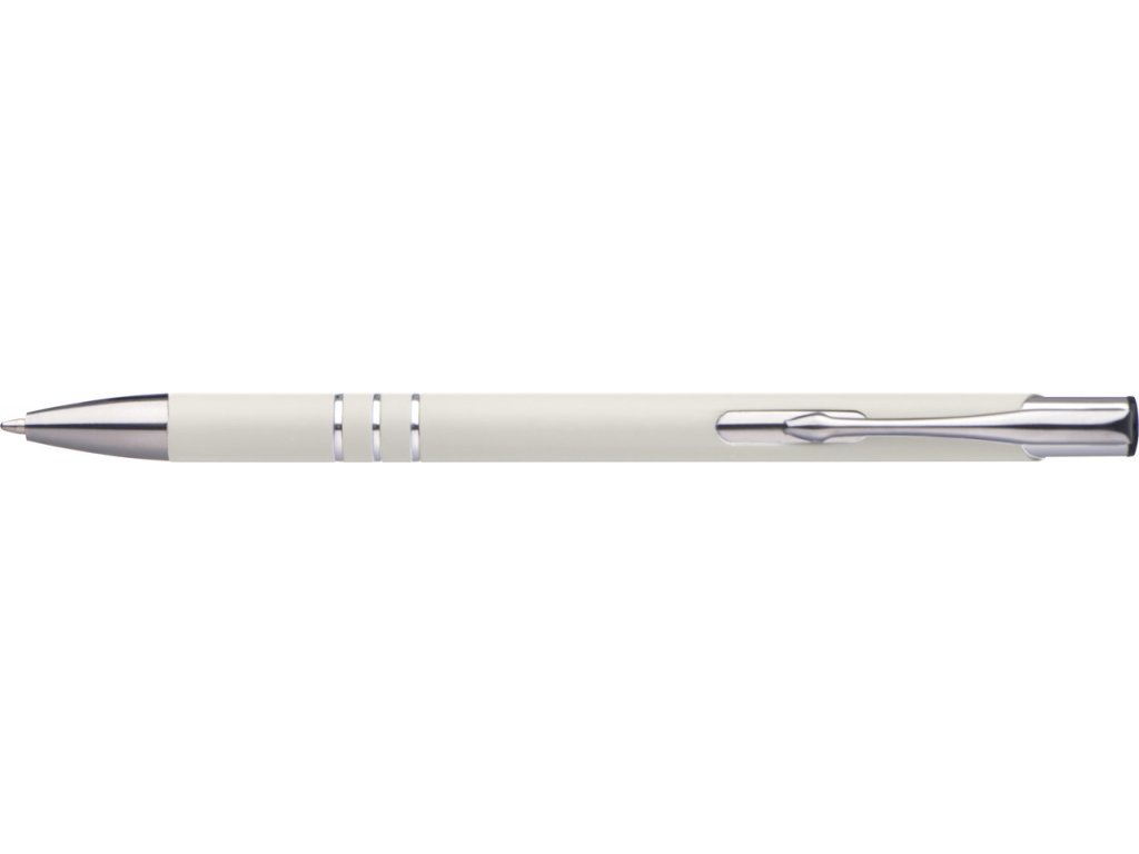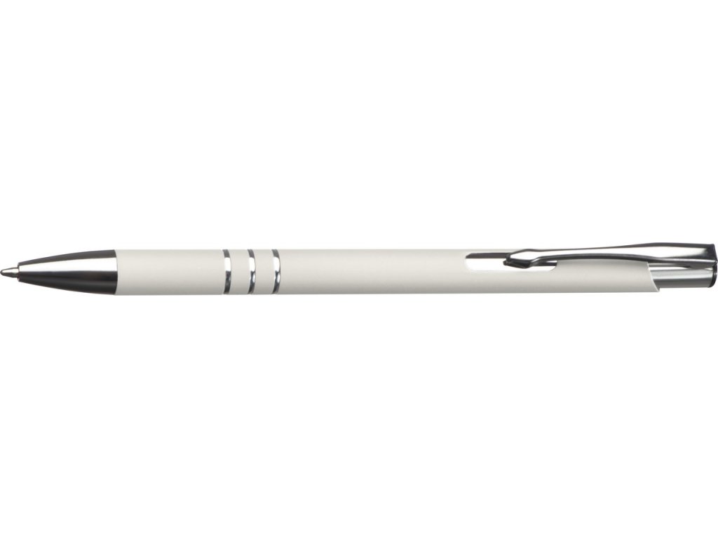 Štíhle kovové guľôčkové pero s pogumovaným povrchom a modrou plastovou náplňou.