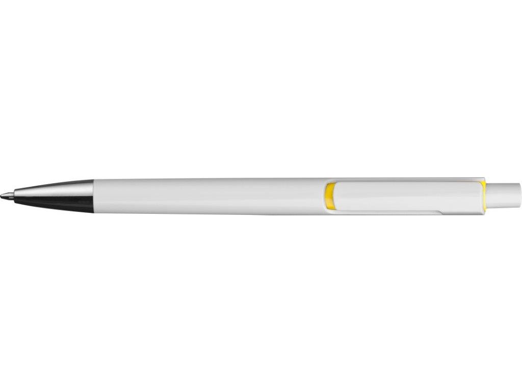 Biele plastové guľôčkové pero s farebnými časťami a jumbo náplňou. Pero má modrý atrament.