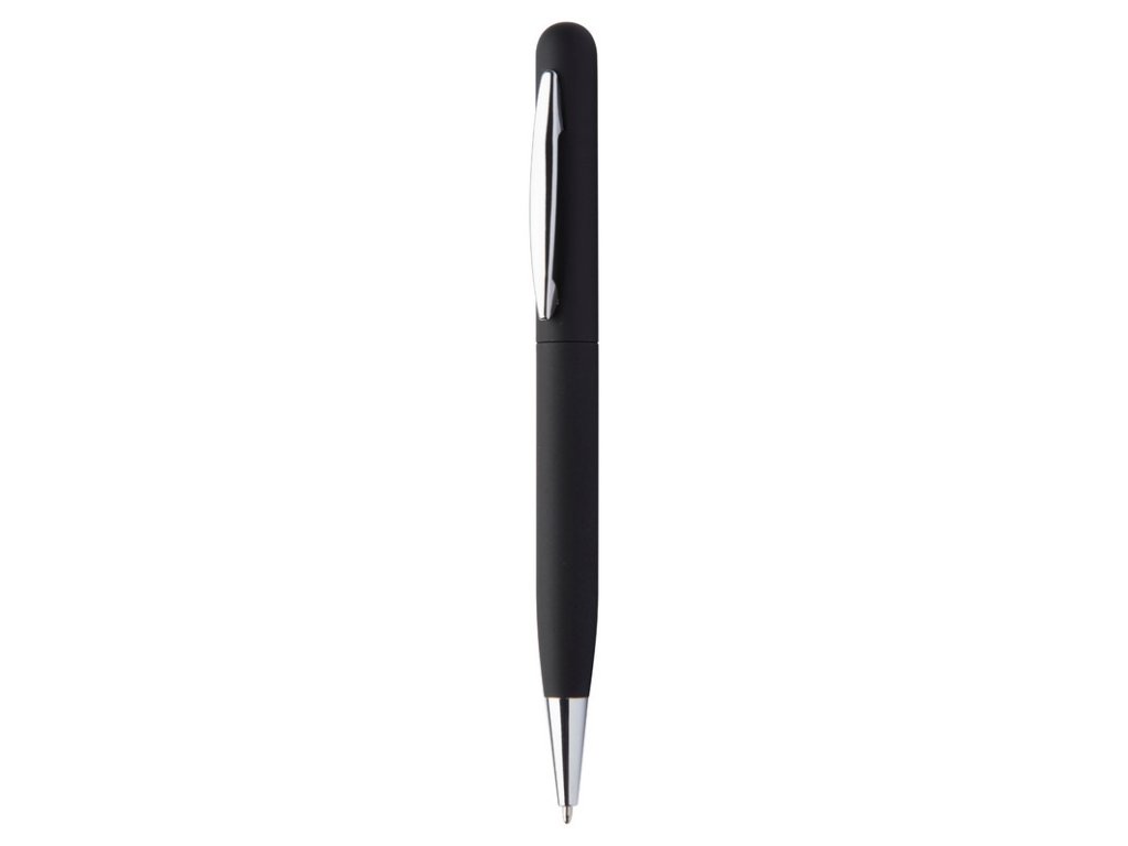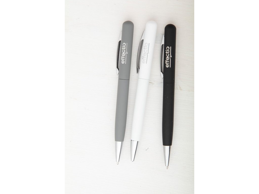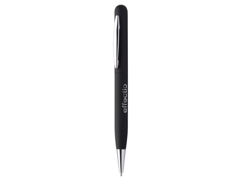Kovové twist guľôčkové pero s pogumovaným povrchom a modrou náplňou. Špeciálny povrch pre laser strieborného loga.