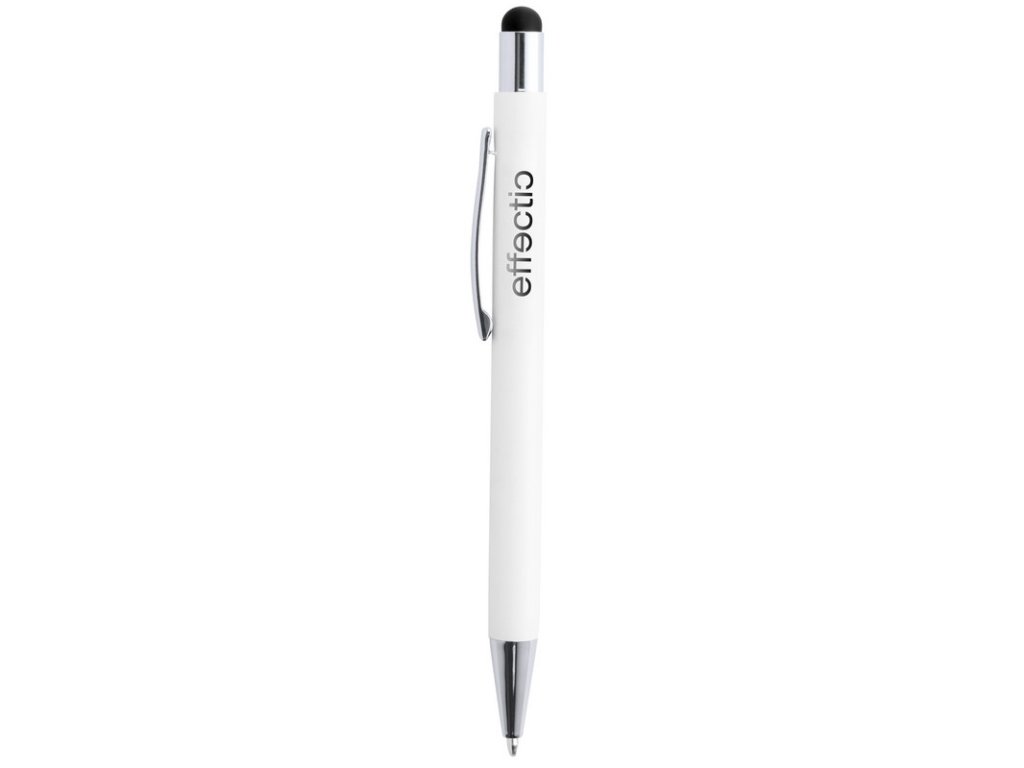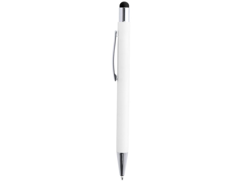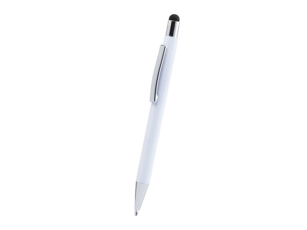 Hliníkové guľôčkové a dotykové pero s pogumovanou úpravou a špeciálnym povrchom pre zrkadlový laser vo farbe stylusu, s modrou náplňou.