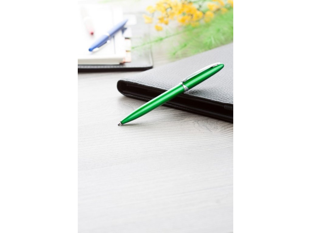 Plastové farebné guľôčkové pero. Dodáva sa s modrou náplňou.