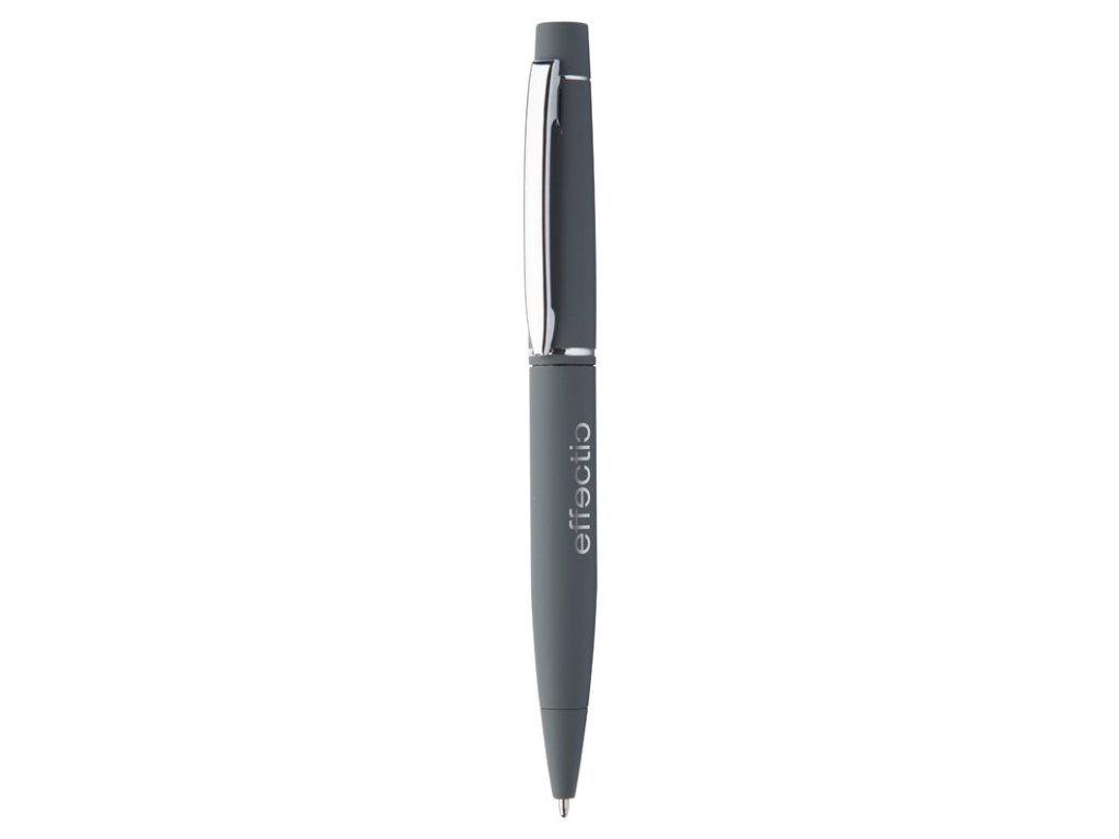 Kovové twist guľôčkové pero s pogumovaným povrchom a modrou náplňou. Špeciálny povrch pre laser strieborného loga.