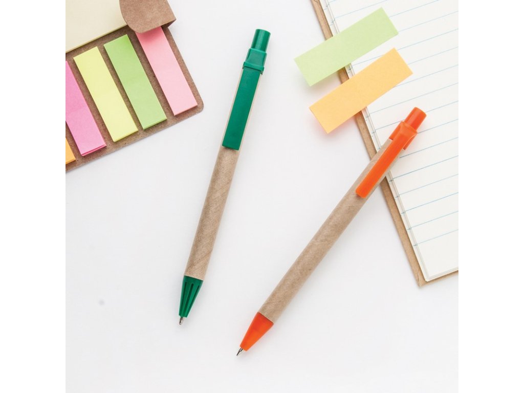 Recyklovateľné papierové guličkové pero s modrou náplňou.