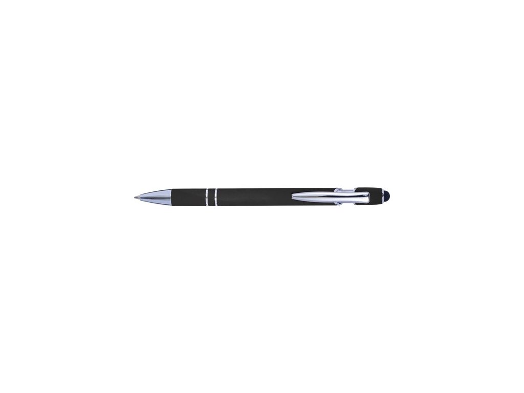 Hliníkové guľôčkové pero s gumovým poťahom a s dotykovým hrotom. Špička a spona sú z plastu striebornej farby. Modrý atrament.