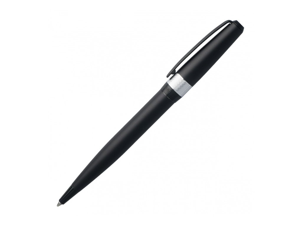 Ergonomické a moderné guľôčkové pero Canal má luxusný kontrastný krúžok vyrobený z gilošového vzoru. Modrá náplň. Darčeková krabička Cerruti.