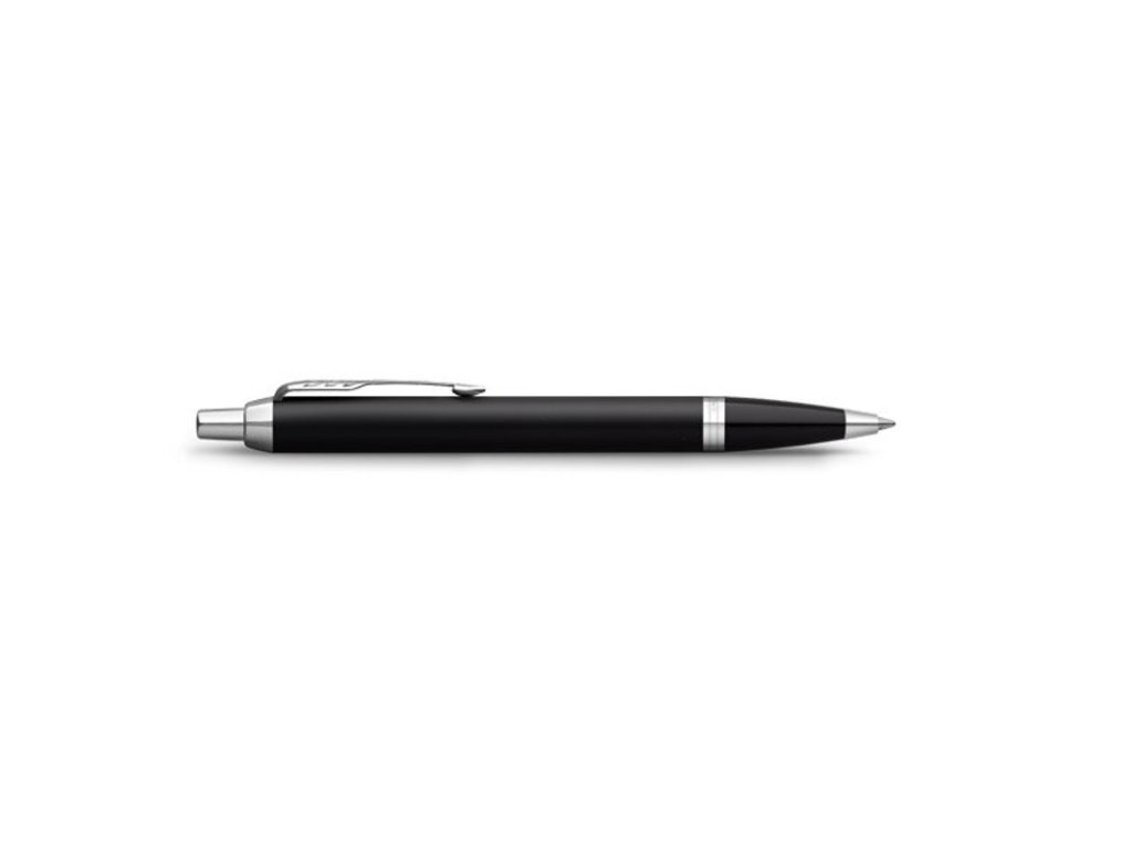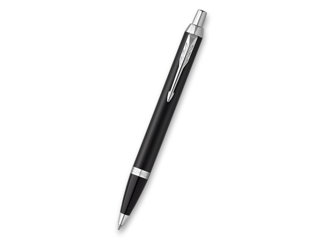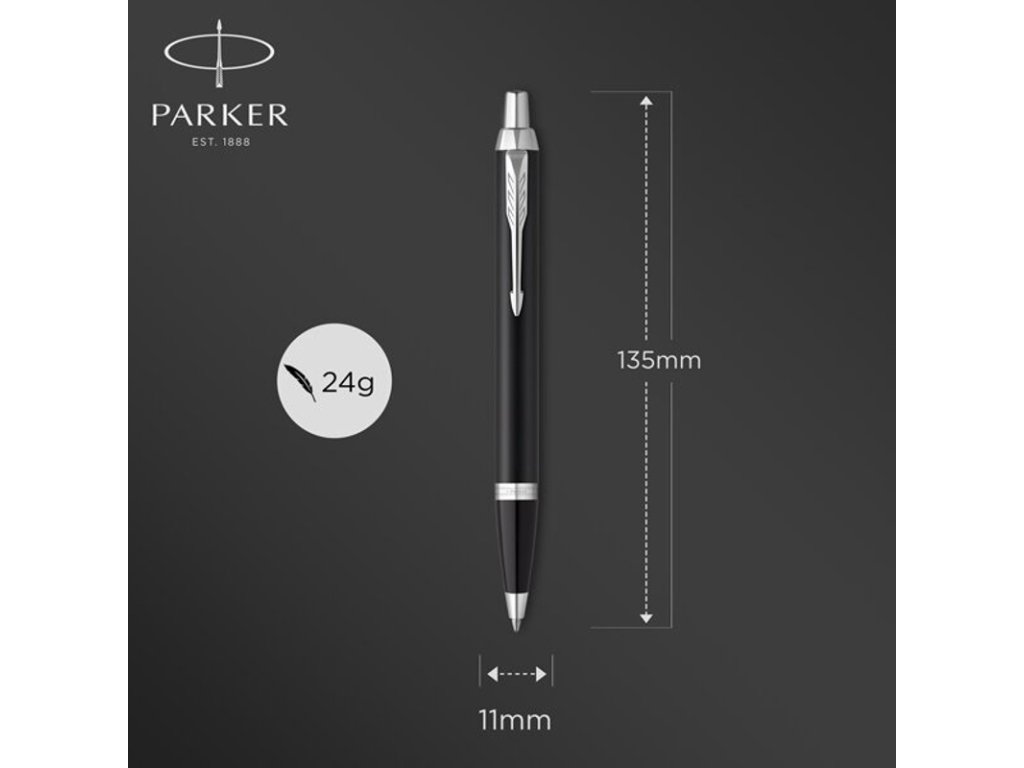 Čierne guľôčkové pero Parker IM Essential má mosadzné telo s matnou lakovanou povrchovou úpravou. V kombinácií s doplnkami pokovovanými chrómom. Modrá náplň.