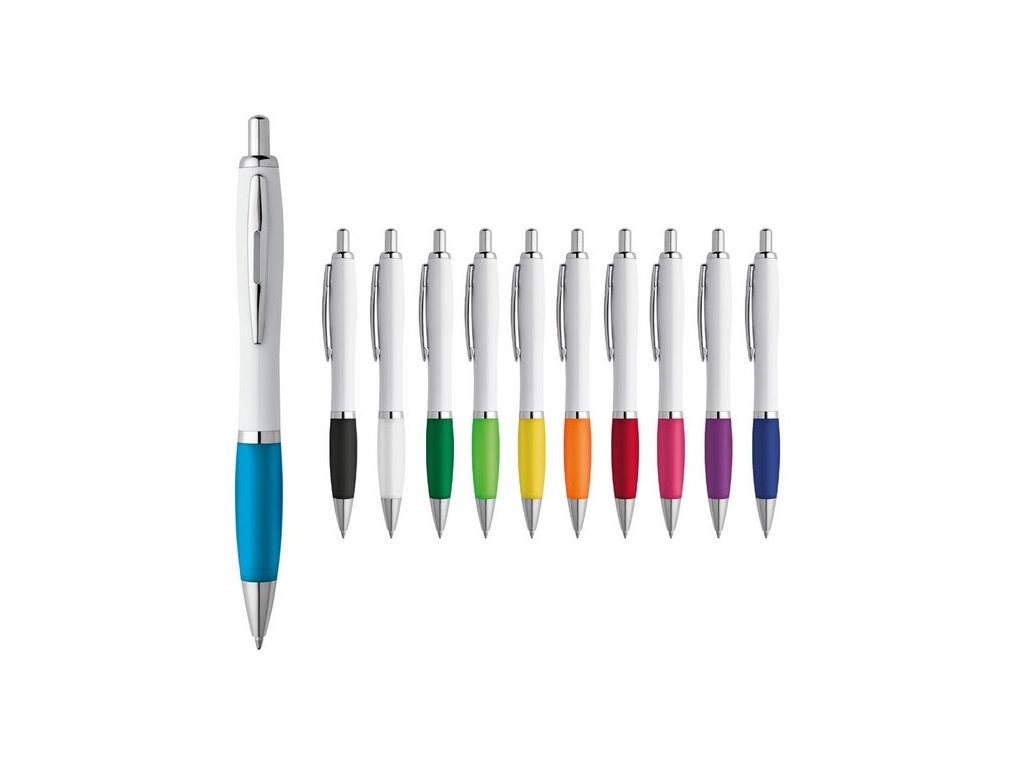 Guľôčkové pero s kovovou sponou a protišmykovou rukoväťou. Guľôčkové pero s bielym telom. The additional information presented is indicative and may vary