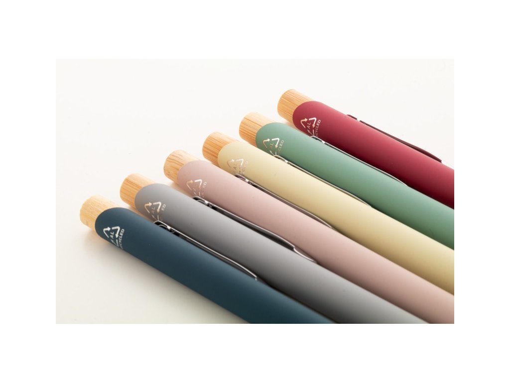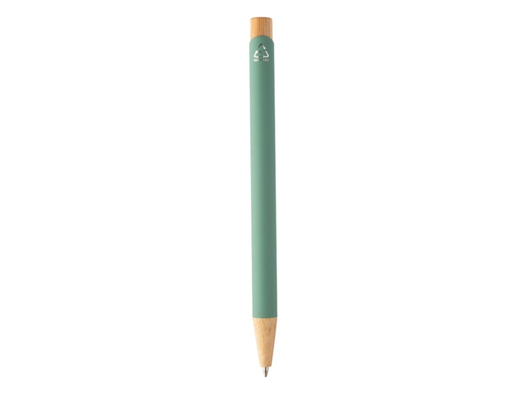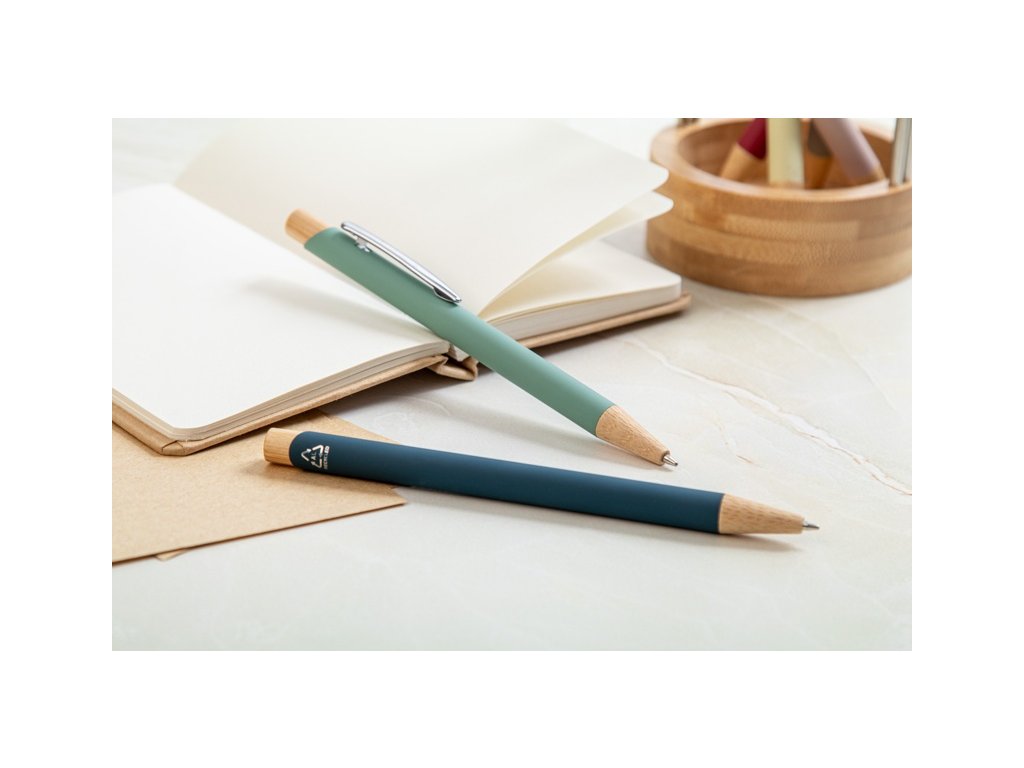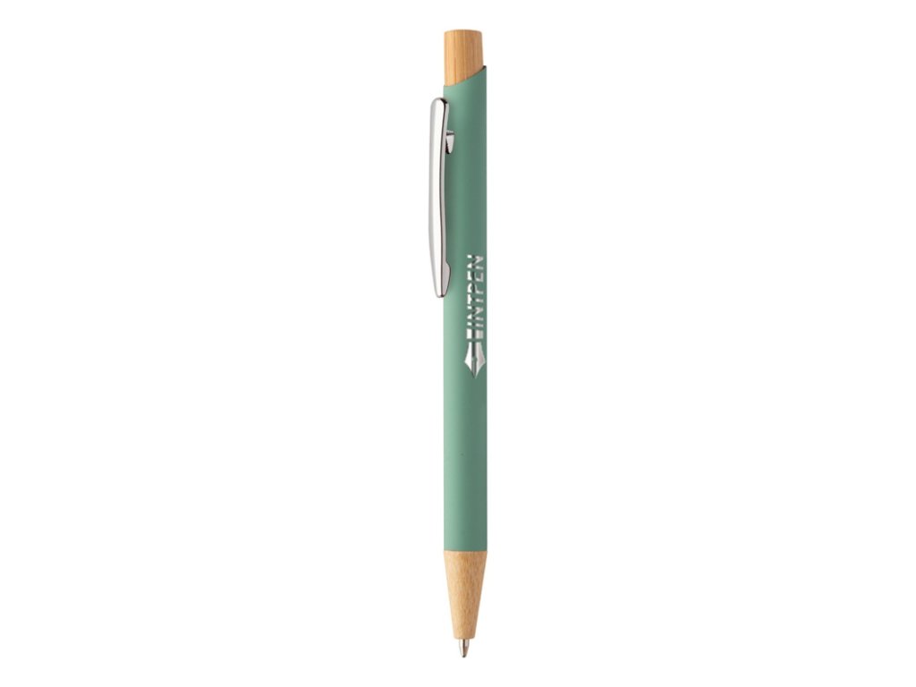 Guľôčkové pero z recyklovaného hliníka s bambusovými časťami, pogumovaným povrchom a chrómovým klipom. So špeciálnou vrstvou na zrkadlové laserové gravírovanie. S modrou náplňou.