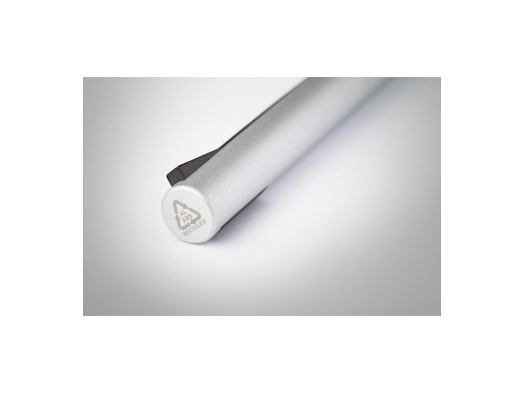 Guľôčkové pero z recyklovaného hliníka s matnou metalickou povrchovou úpravou. Horná časť z recyklovaného ABS. S modrou náplňou.
