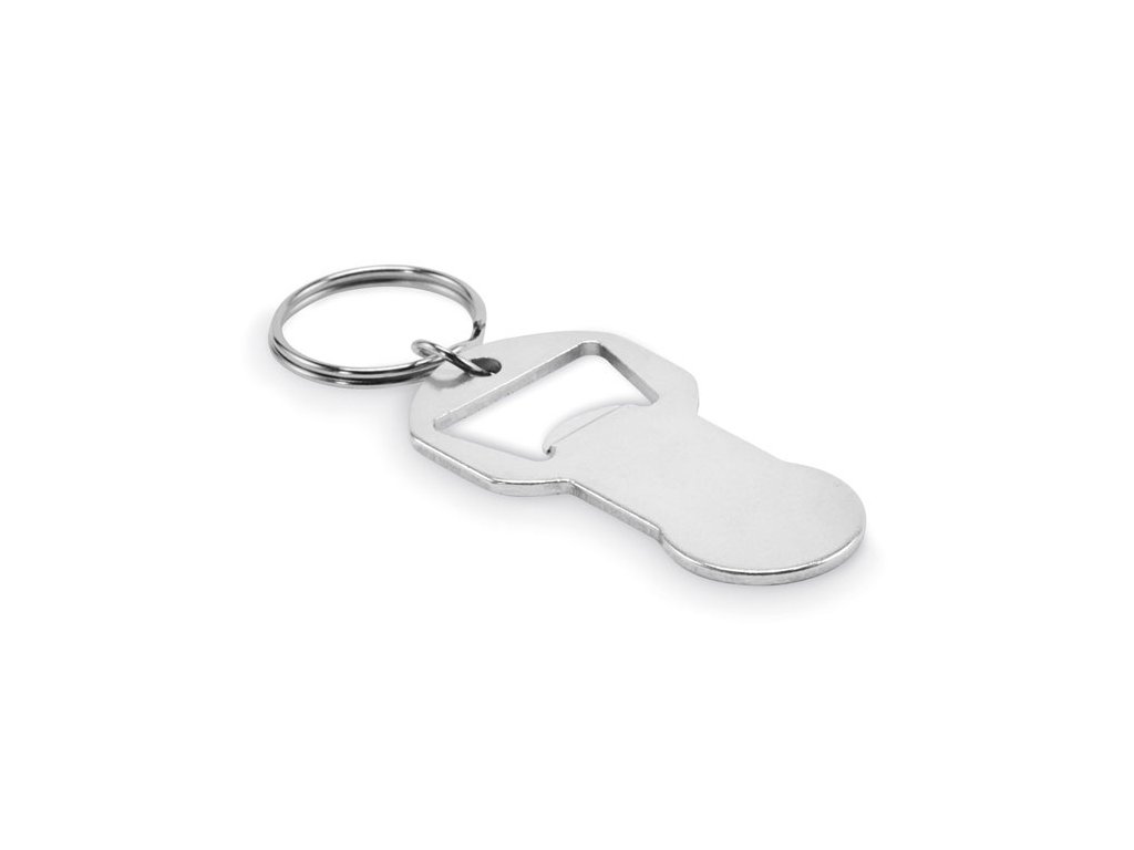 Prívesok na kľúče s otváračom na fľaše vyrobený z recyklovaného hliníka so železným krúžkom.
