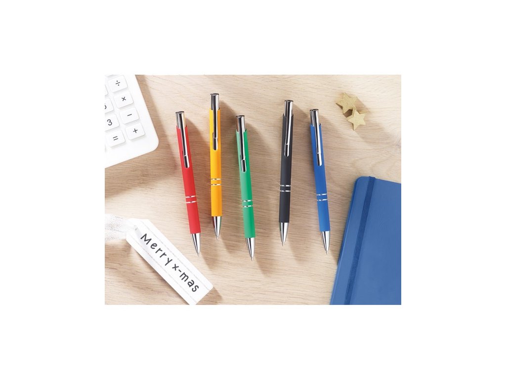 Guľôčkové pero v pogumovanom vzhľade s lesklými doplnkami. Modrý atrament.