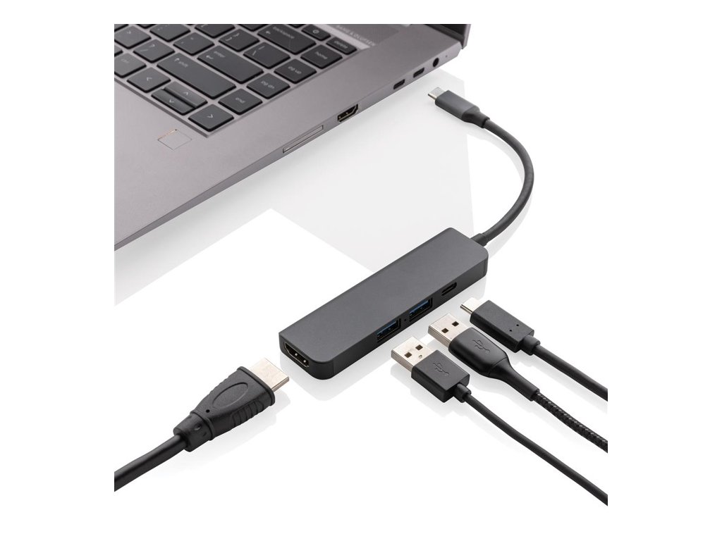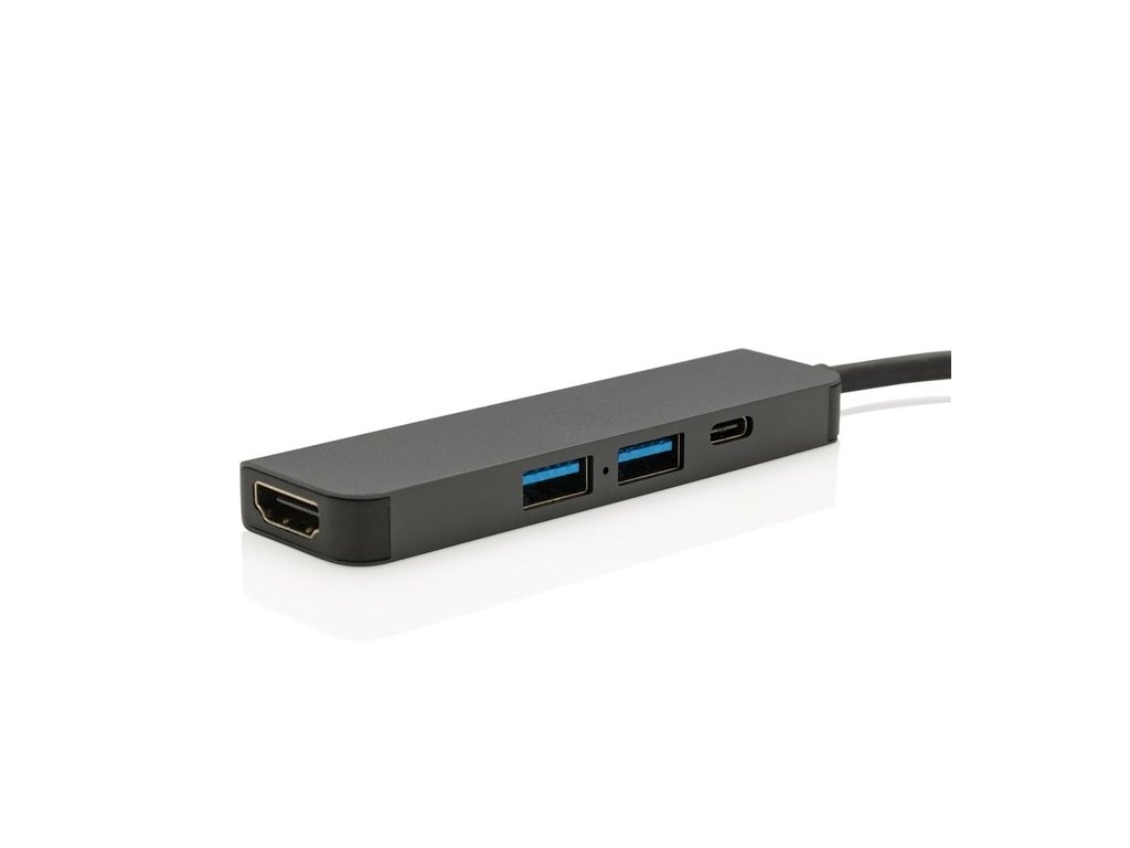 Hub vybavený 1x USB A 2.0, 1x USB A 3.0, 1x USB C a 1x 4k HDMI portom. Podiel recyklátu: 58%. Integrovaný kábel 10cm z RCS recyklovaného PET a TPE. Duálny konektor USB C/USB A pre zapojenie do každého počítača. Podporuje prenos dát. FSC® balenie.